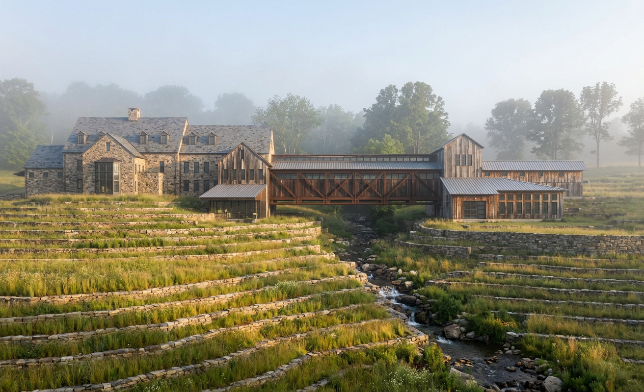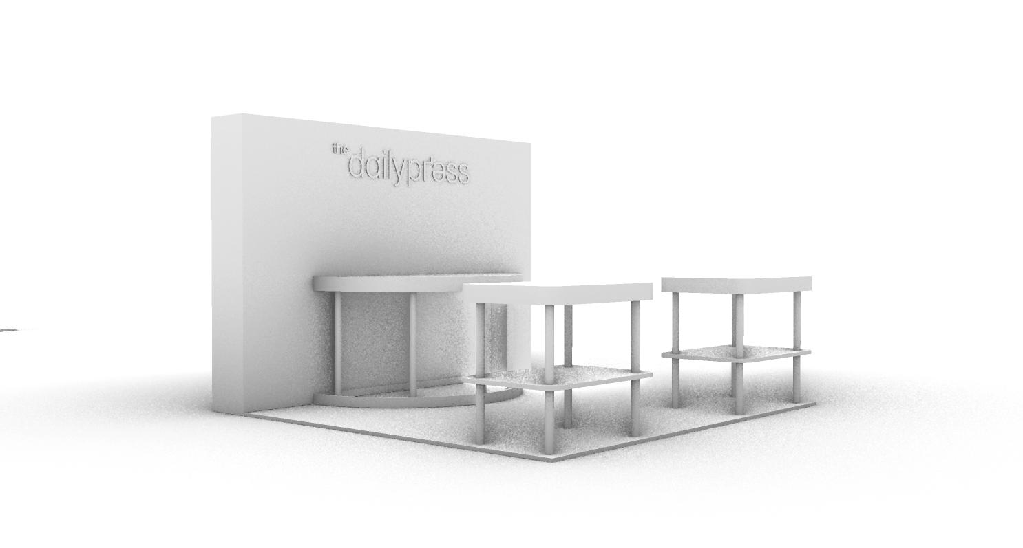 a small interactive booth design for a skincare brand made with stainless steel there is a metal board backdrop at the back wall with lists stuck on it there are two displays and on top are press machines and science lab equipment together with skincare glass bottles on top of the displays are also herbs and plants to add depth warm lighting