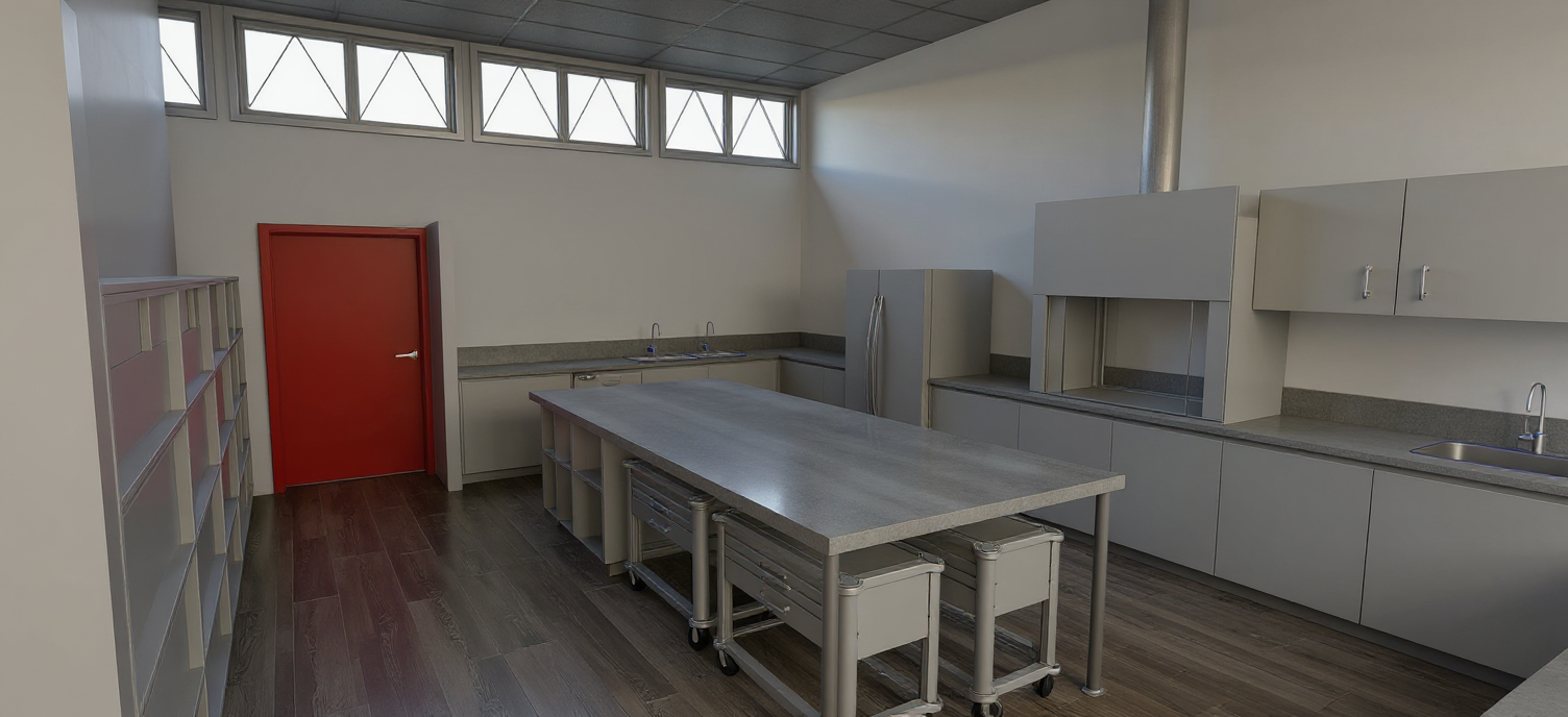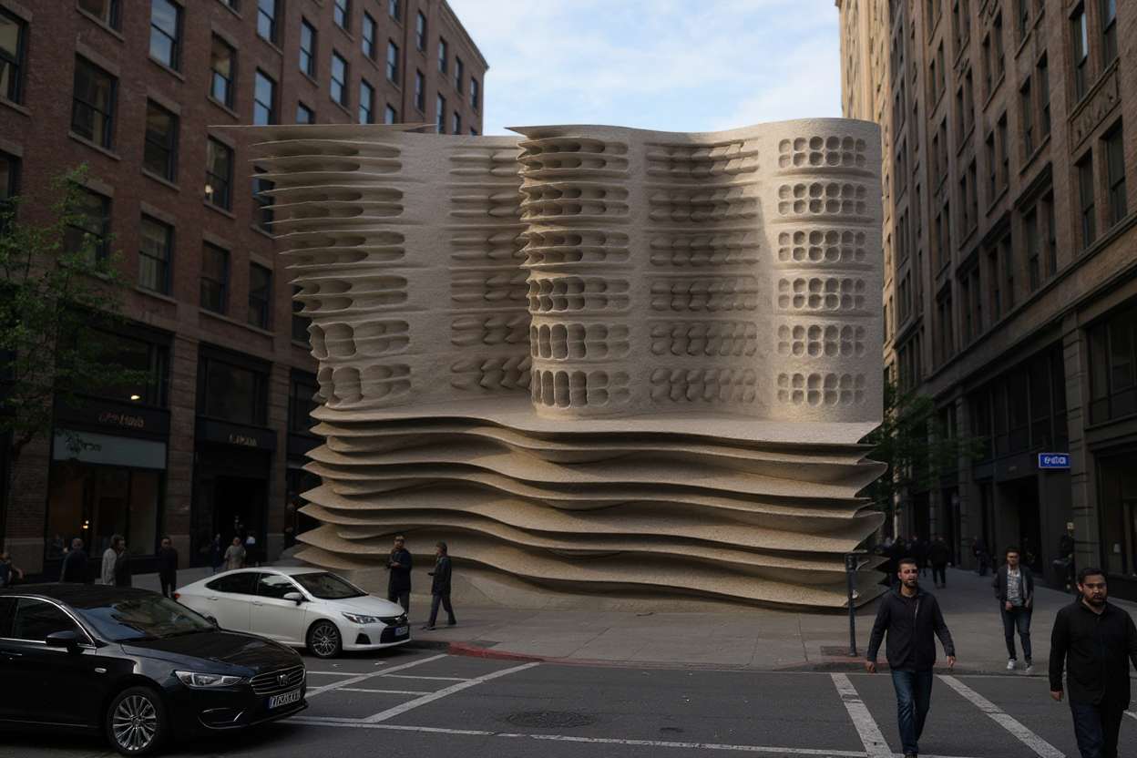 create a realistic imag of this being a facade of a building add people walking past make this in a city block