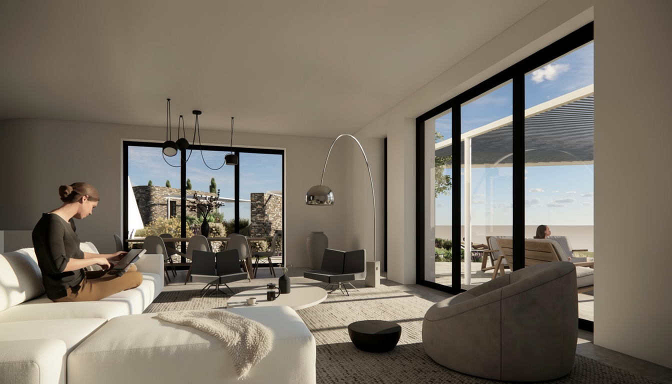 light blue sky with clouds planting along fence maintain geometry no cars screened porch