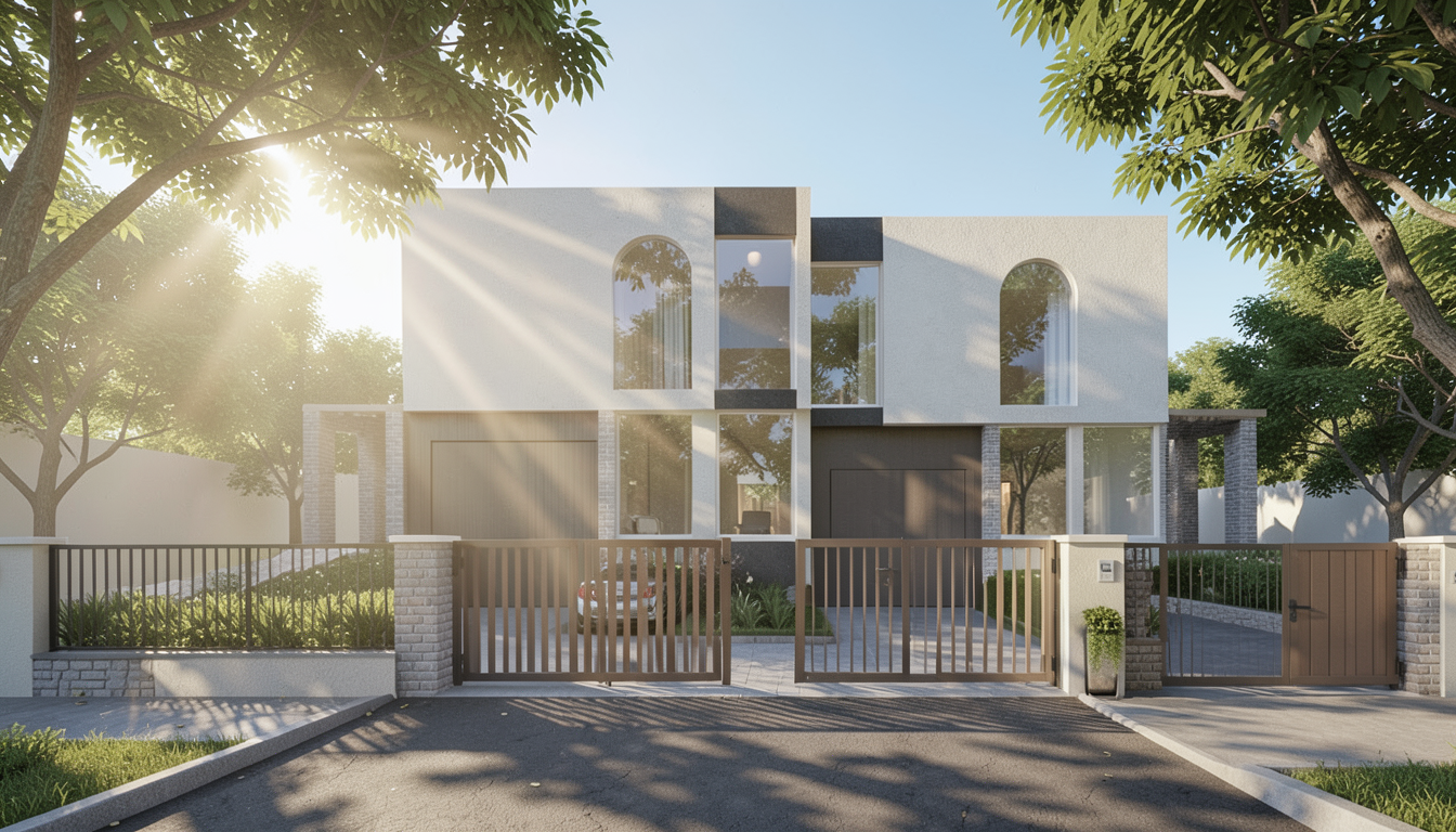 add short front fence clean contemporary and slightly mediterranean inspired fence design 2 car gate at the 2 driveways and 2 pedestrian gate on the 2 sides