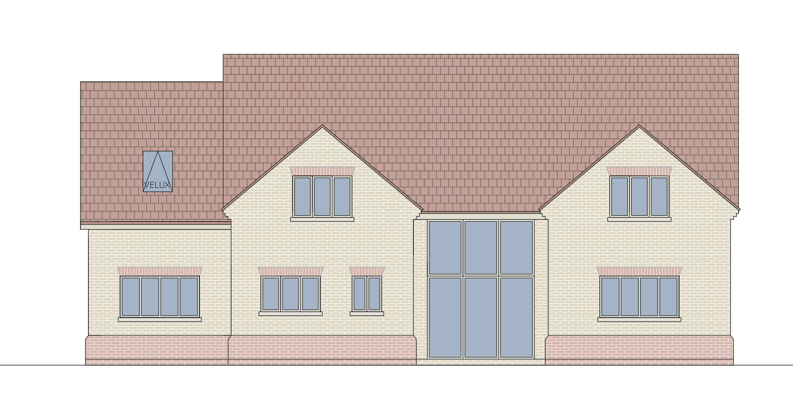 create a rendered cgi image of this front elevation for the yellow brickwork use a buff yellow multi brick like wienerberger st ives cream rustica for the red brickwork and soldier courses use audley antiques for the roof tiles use a dark red slightly brown clay plain flat tiles for the upvc windows use a beige colour
