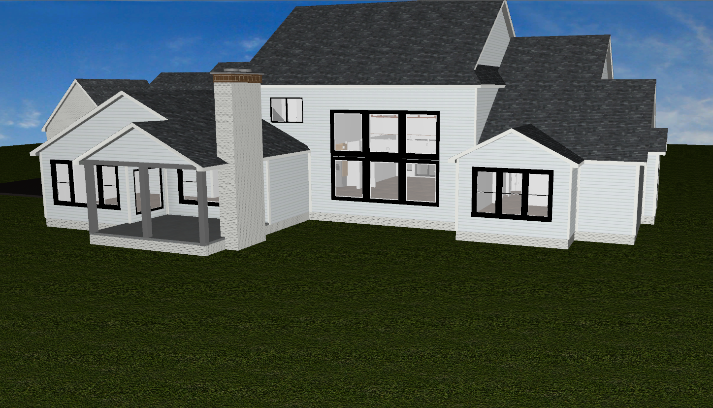 make as photorealistic as possible while keeping textures the same as selection professional landscaping in a lightly wooded scene with good lighting match materials to plan and remove any text white siding black trim black windows black porch post