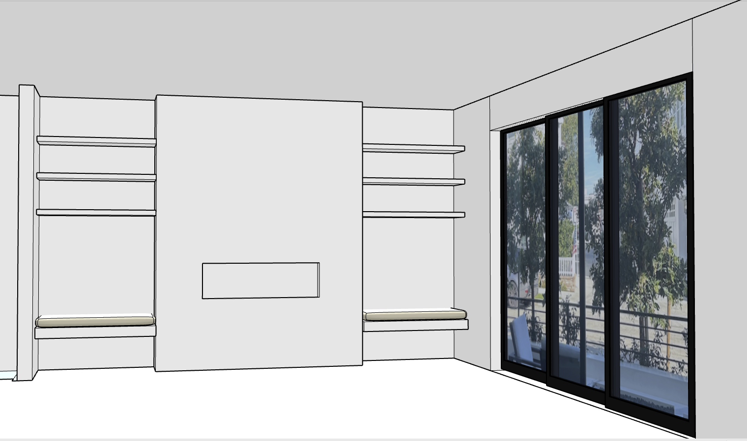 photorealistic rendering of the provided 3d interior model maintain the exact geometry proportions camera angle and layout do not redesign or move any elements apply realistic materials and finishes to match a modern newport beach residential interior based on the reference conditions fireplace wall full height fireplace surround clad in black ceramic or porcelain tile in a herringbone pattern tile has a slightly reflective satin to semi gloss finish with visible grout lines subtle variation in tone within the black tile charcoal to deep black to avoid a flat appearance linear gas fireplace opening centered horizontally with a long narrow rectangular proportion wall mounted tv above fireplace flush and centered built ins both sides of fireplace floating wood shelves in a warm medium light oak tone with natural grain variation shelves have a clean square edge profile minimal thickness integrated bench seating below on both sides bench bases painted to match wall color soft warm white seat cushions in a light neutral fabric off white warm beige soft texture slightly rounded edges walls and ceiling smooth drywall finish in a warm white not cool white matte finish soft light absorption flooring wide plank light oak wood flooring natural grain variation matte finish warm undertone windows and doors large sliding glass doors with slim black metal frames glass should have realistic reflections and exterior daylight visible lighting natural daylight as primary source coming from windows doors on the right side soft realistic shadows and light falloff no harsh artificial lighting furniture do not include a coffee table keep space minimally furnished or leave foreground open if not modeled styling light minimal decor on shelves ceramics books small plants neutral tones only avoid clutter rendering quality ultra photorealistic materials accurate textures fabric softness wood grain detail realistic reflections shadows and ambient light no stylization no conceptual look avoid changing layout or proportions adding new architectural elements overly glossy or fake looking materials high contrast or overly dark rendering
