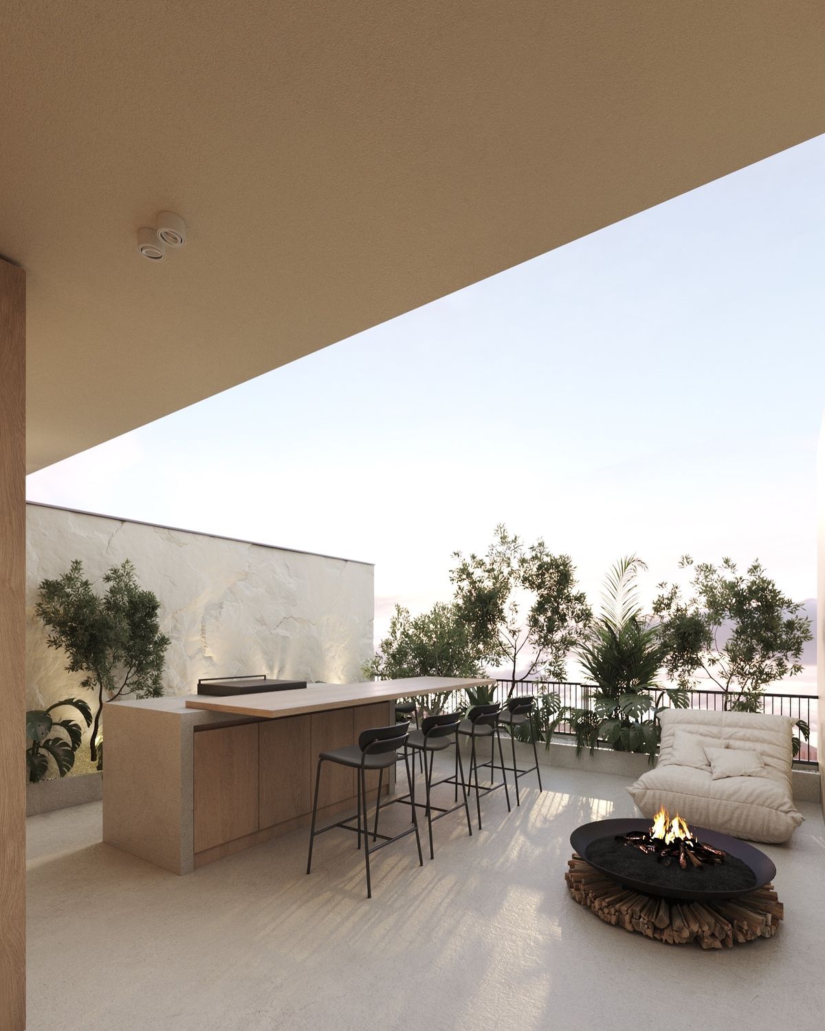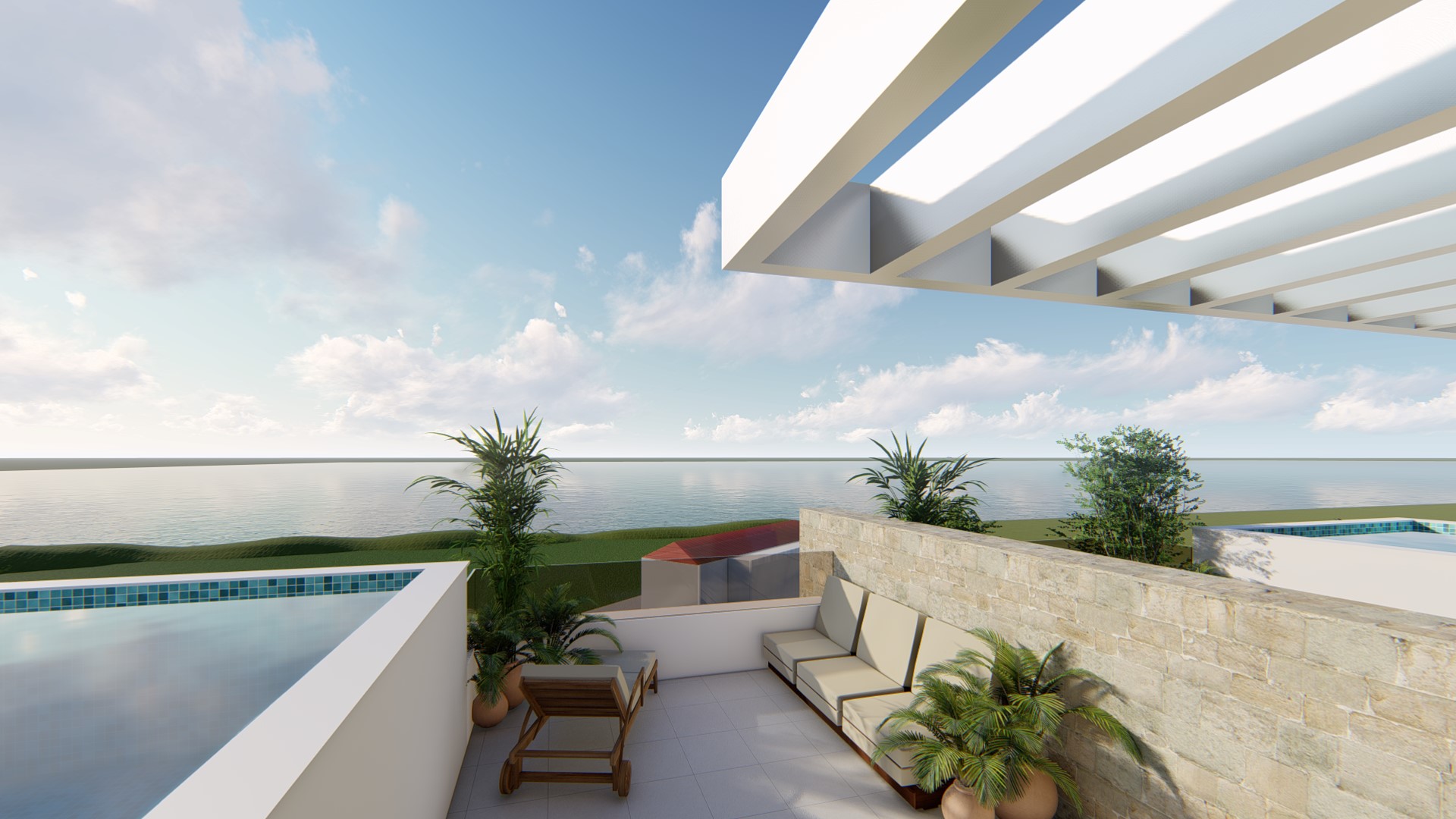 exterior shot luxury terrace with girl bathing in a pool on the left side terrace view on a small marina in upper right corner of the frame sea view centraly small fisherman village houses on the left upper corner of the frame