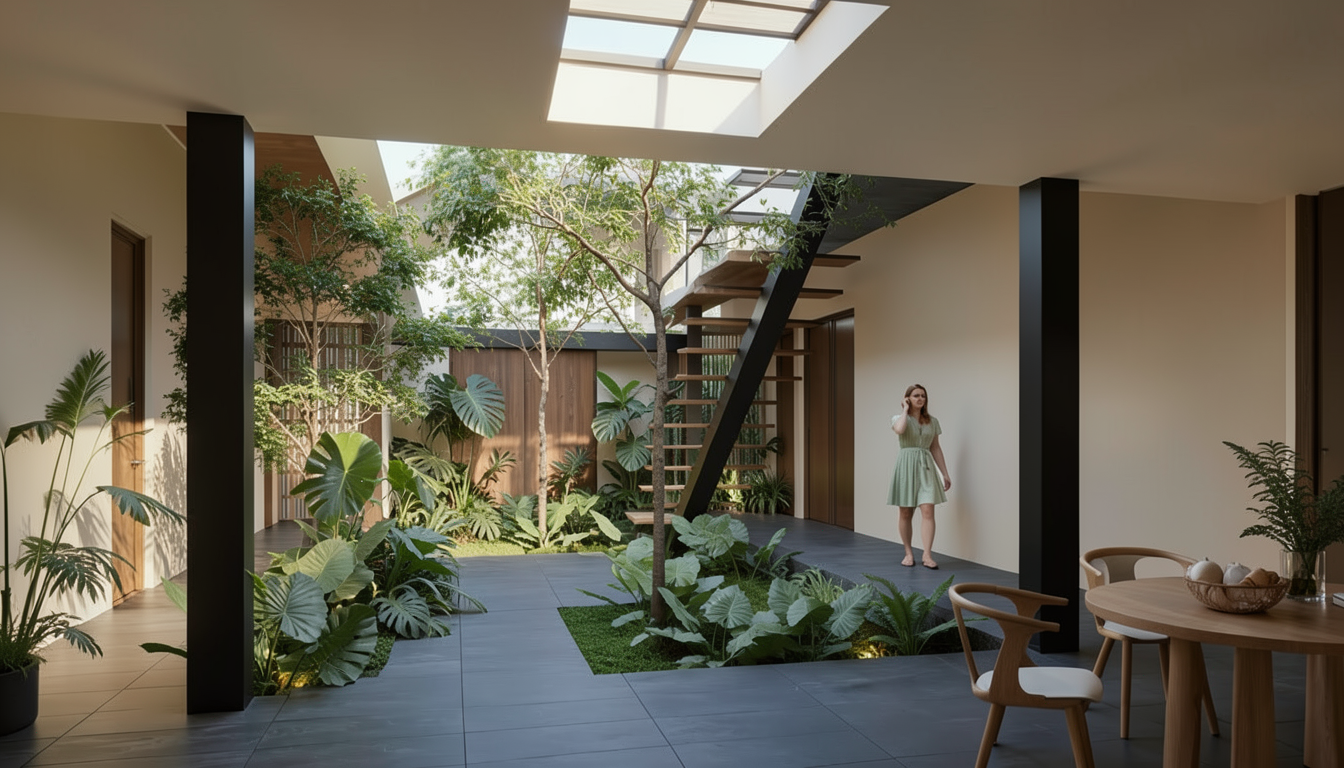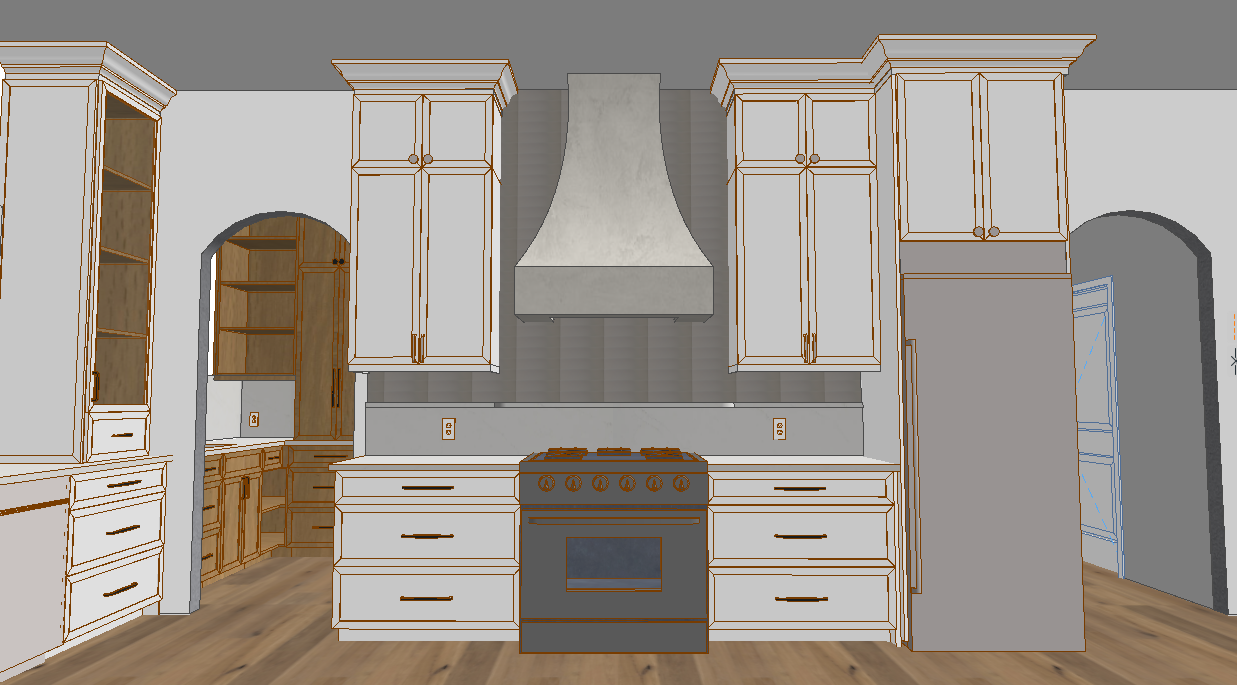 a modern contemporary kitchen design with a warm wood oak flooring complements a alabaster white cabinet including the upper cabinets warm marble countertops including a fraction of the way up the kitchen backsplash the rest of backsplash is a soft textured white subway tile with hints of cream and stainless steel gas range and stainless steel fridge the soft curve range is done is a soft white cream texture cabinets have matte black handles warm soft wood accents cabinets illuminate the left pantry the design the atmosphere is calm and relaxing atmosphere white marble countertops creating a relaxing spa like atmosphere