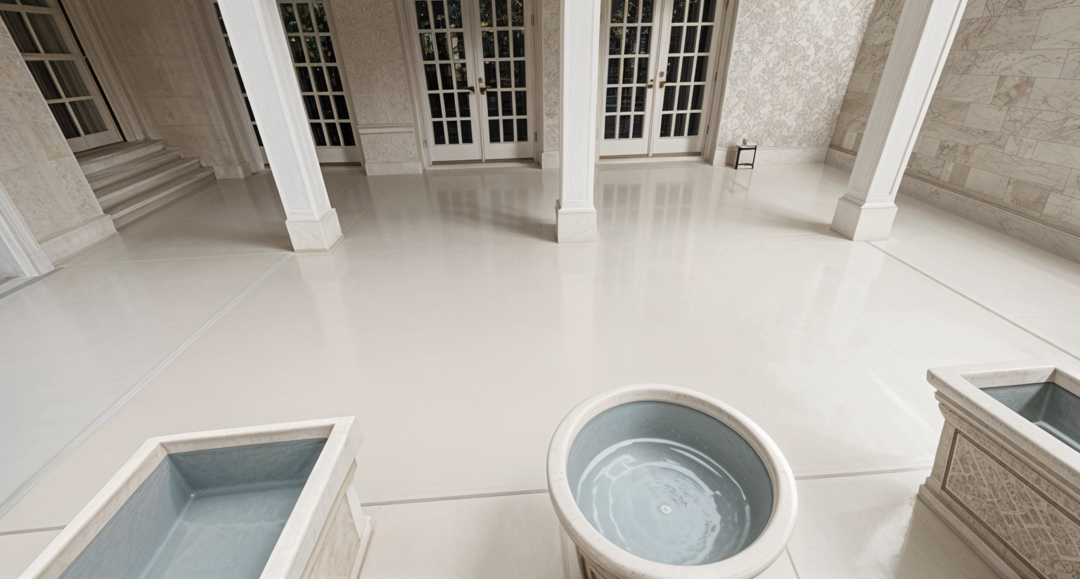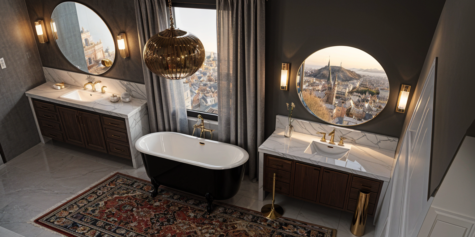 realistic image luxury bathroom tall cabinet between vanities with mirror on top panel give vanities furniture legs add matching mirrors at each vanity with sconce lights on each side of mirrors add pendant light above bathtub fill tub with water add small mosaic glass tile on wall behind tub up to ceiling and glass shower wall on left will tile inside shower add fluffy white rug on floor add pendant light over tub remove pendant light in room make rug larger and oval shaped add pendant light over tub remove window at tub make cabinetry more white show light outside windows correct the rug shape correct the columns and arch