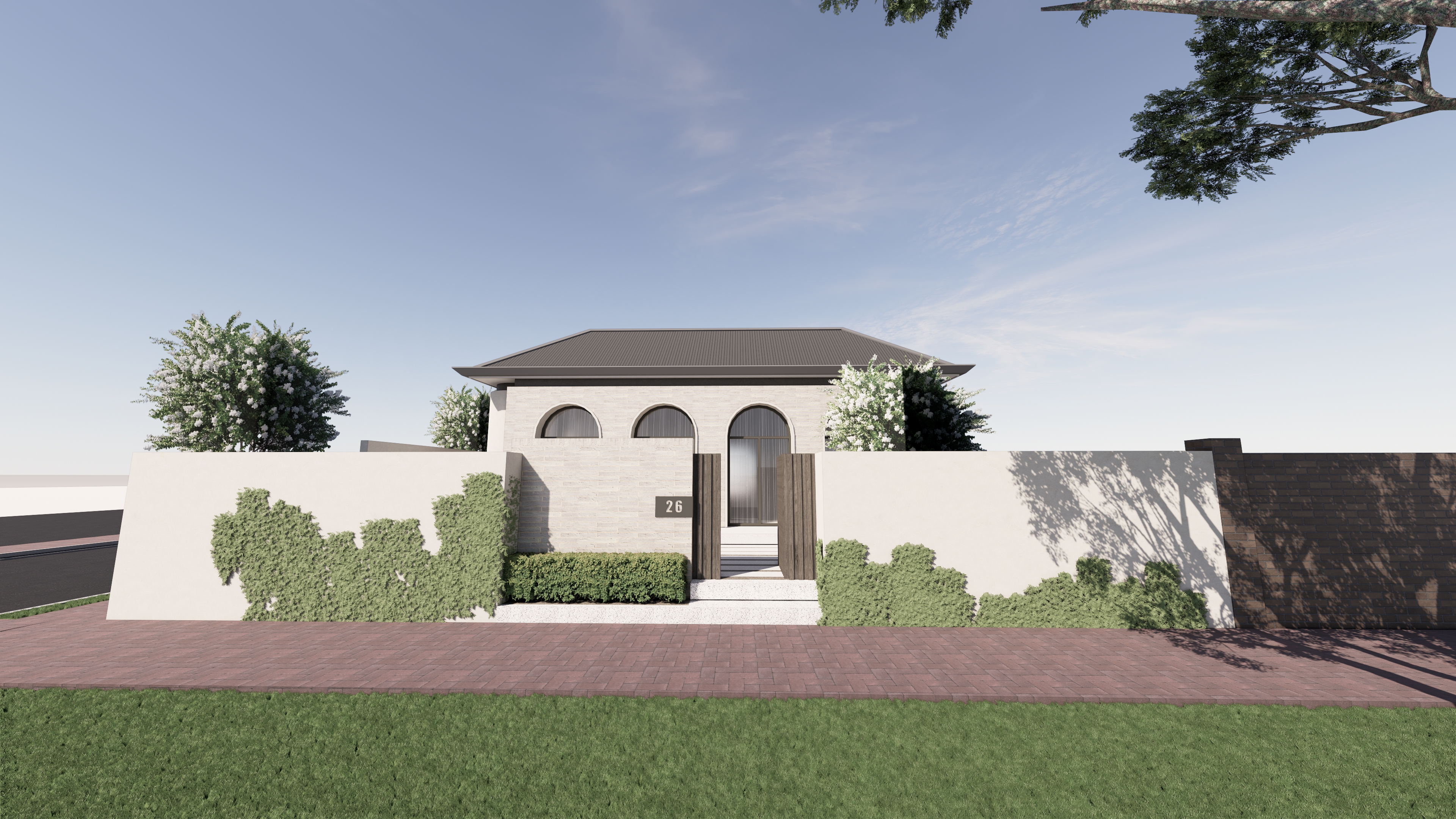 looks good but i dont want cobble stone to the facade i want the same tile i had from my original image also brighten the landscaping it looks to dark and the plants on the fence needs to be tighter to the wall