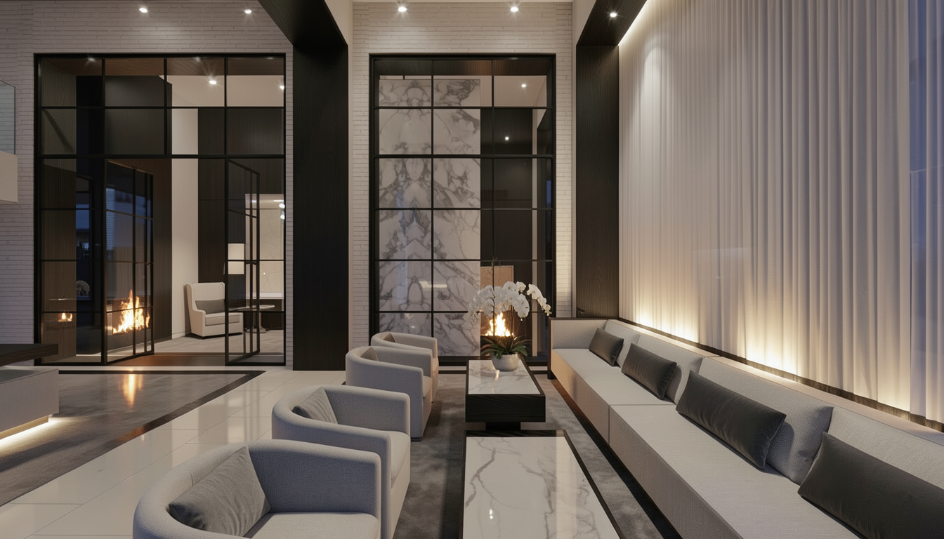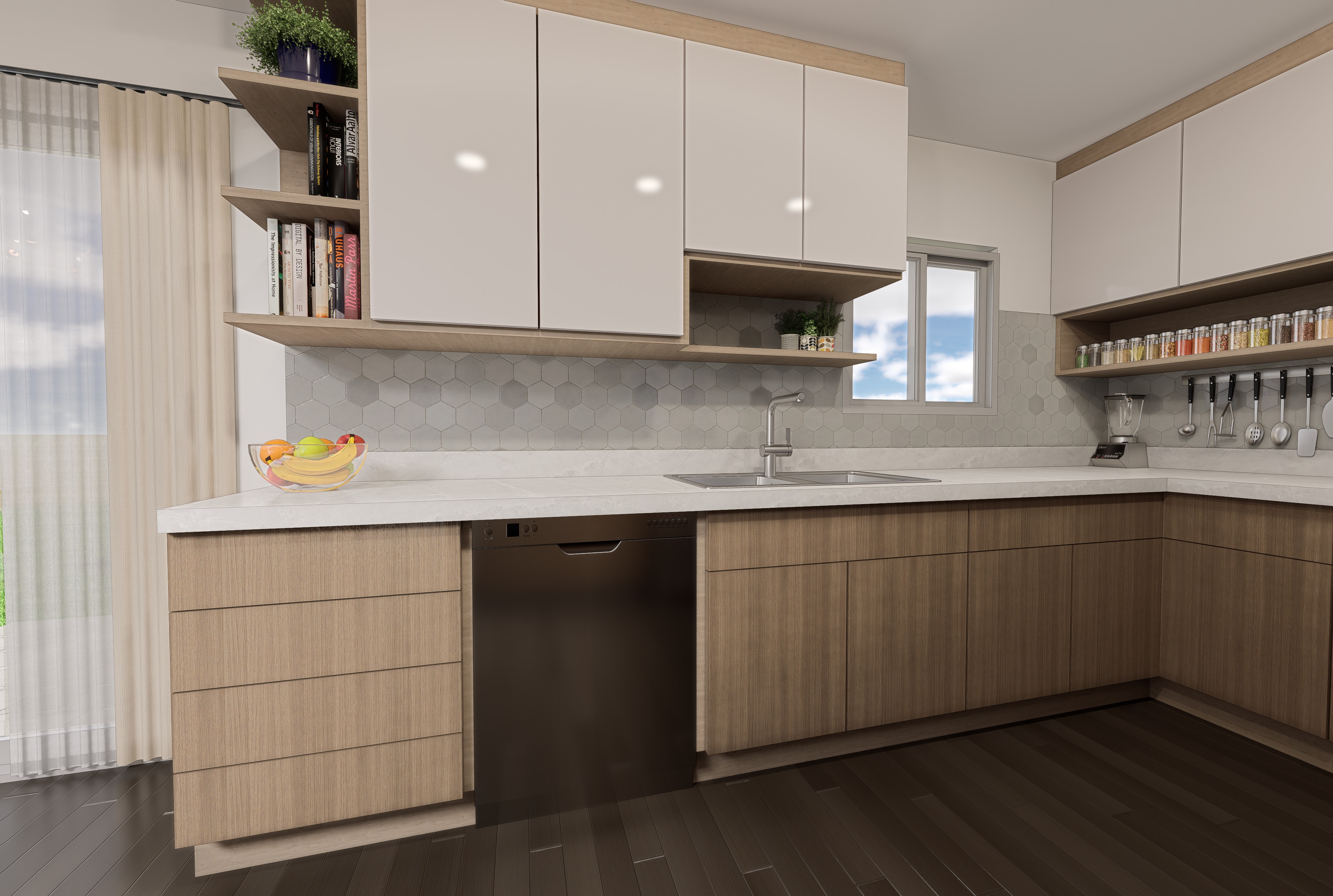 high end photorealistic 8k architectural render of the exact kitchen layout l shaped configuration with light oak lower cabinets and glossy off white upper cabinets accurate representation of a built in black matte dishwasher and a single bowl stainless steel undermount sink with a modern gooseneck faucet backsplash features light gray hexagonal tiles with realistic depth and thin grout lines open wooden shelving on the left holding specific books and a small plant and a wooden spice rack section under the right cabinets with glass jars and hanging utensils white quartz countertop with high quality subtle marble veining flooring in dark espresso wood planks with soft reflections lighting global illumination soft natural light from the small center window and warm recessed ceiling spotlights realistic ray traced reflections on the glossy upper cabinets sharp textures on the wood grain cinematic depth of field interior design photography style