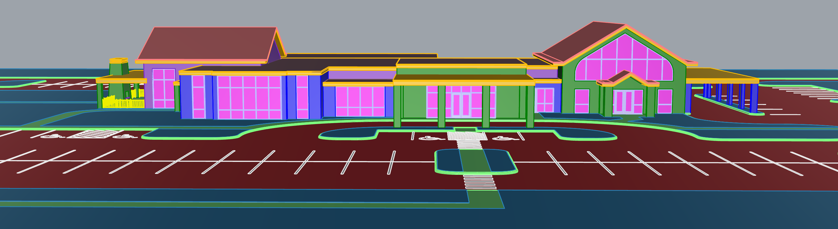 make a photorealistic render of the building above the royal blue should be vertical dark wood slats green should be limestone cladding pink should be reflective glass yellow should be a dark metal flashing purple should be cmu navy blue should be grass red should be asphalt make photo realistic