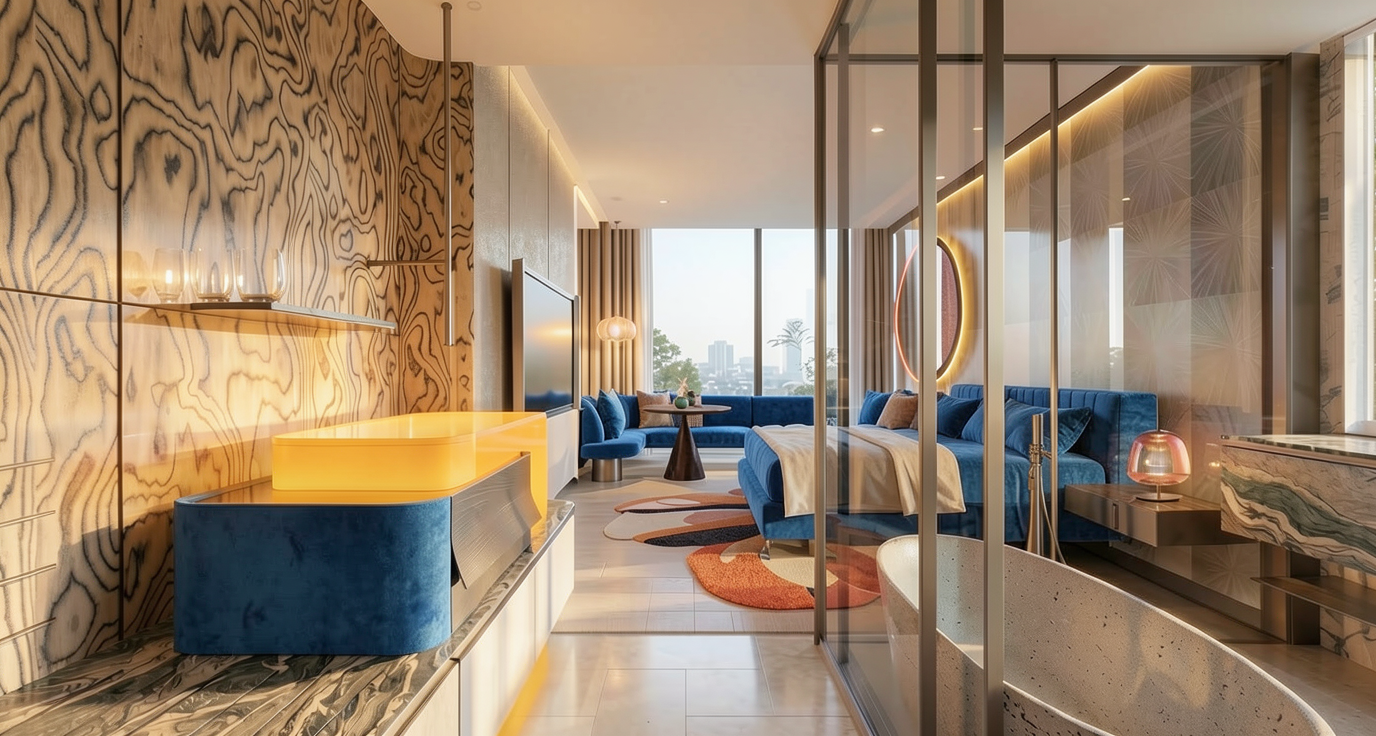 create a night view from this image remove the people from the image illuminate the trees selectively from below illuminate the pool slightly and selectively