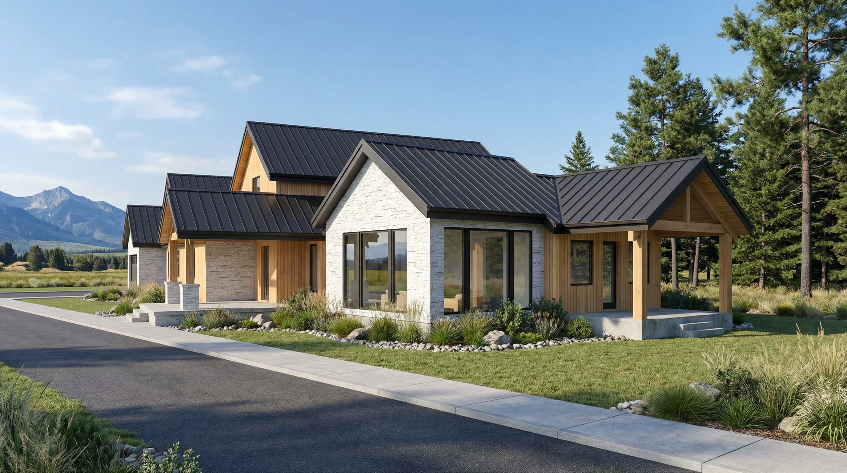 enhance the realism of the existing architectural design while maintaining the same materials and textures focus on realistic lighting shadows and surface details to create a lifelike appearance ensure the mixture of wood siding is preserved in the correct areas making them look authentic and cohesive this is in montana add montana landscape with nice landscaping near the house do not change the shape of the driveway add montana vegetation around the house make wood siding modern vertical 10 wider plank siding natural cedar light warm honey tone clear matte finish clean sharp edges minimal knots contemporary scandinavian farmhouse style high end residential exterior the siding is not board and batten it is wide planks with realistic wood grain texture make the wood siding planks the same width as the image reference make rock a light white color do not change the driveway or the sidewalk do not add a chimney add pine trees to the right and behind the house to the left add mountains far off in the distance do not change the driveway your renders are almost perfect every time but you keep changing the driveway the driveway must stay the same as the reference photo no driveway changes no driveway changes no driveway changes stop adding and changing the driveway god dammit
