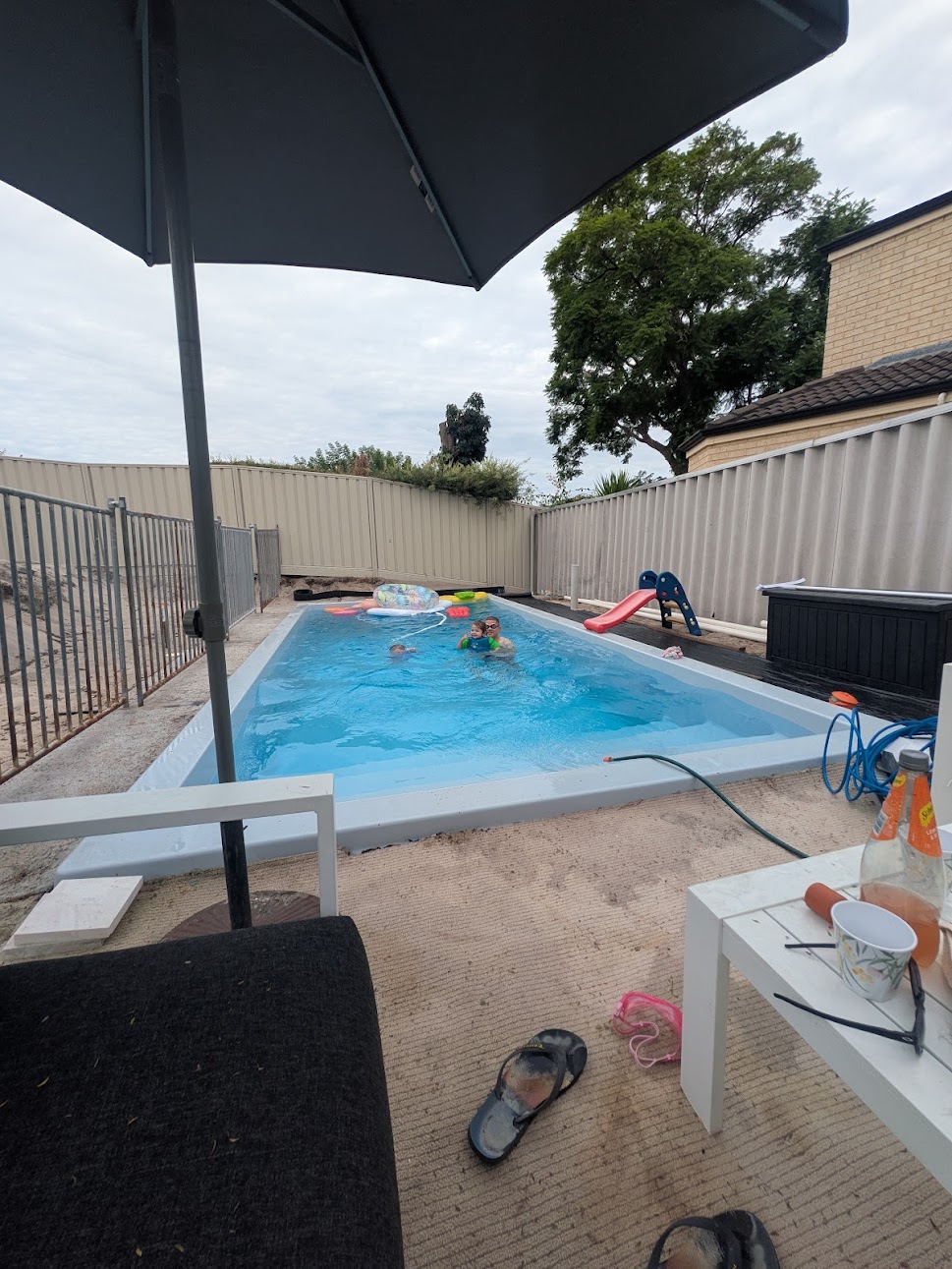 paint the fences white allow for vertical jasmine trellis to the right hand fence pave surround pool in a light limestone paver add succulent greenery to the rear fence