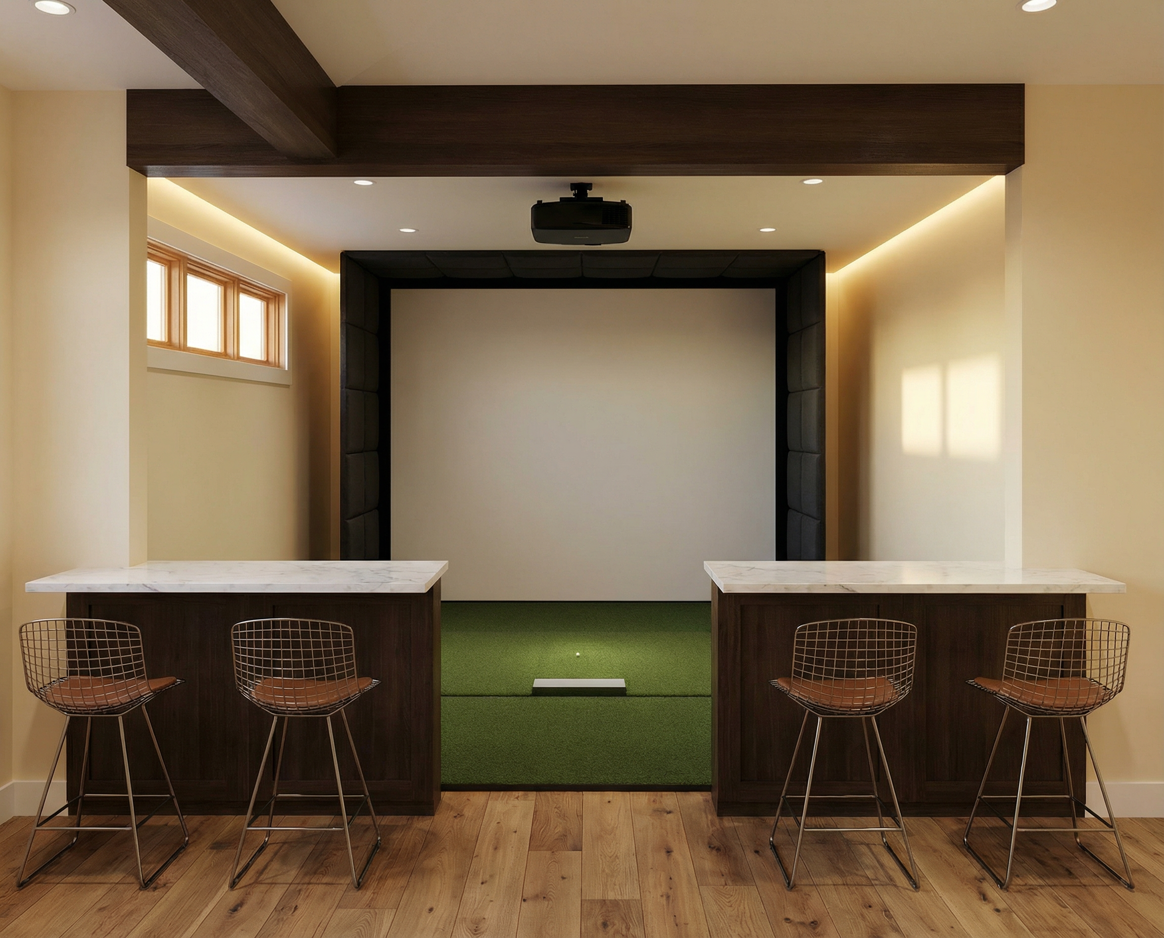 golf simulator room with black projector inside the room keep transom windows no sun shining in the windows and no art on the simulator room walls make walls dark grey in the room and white outside the room