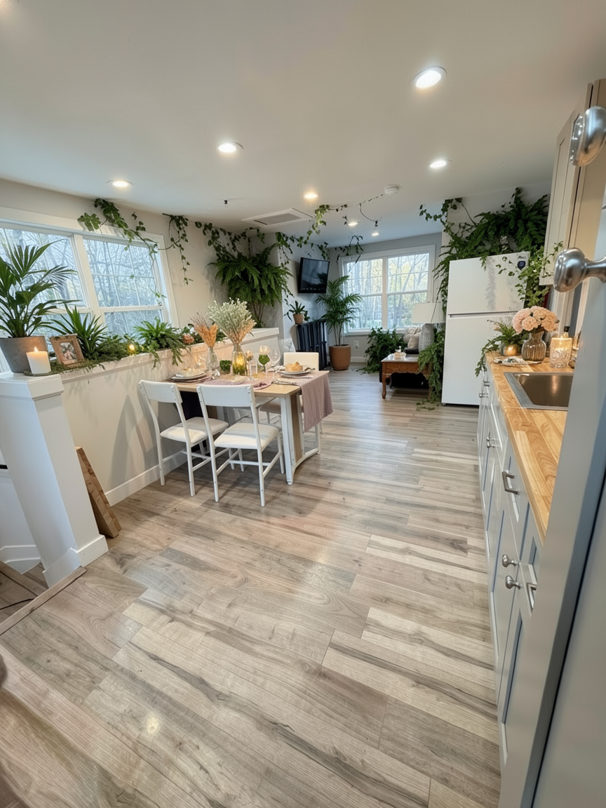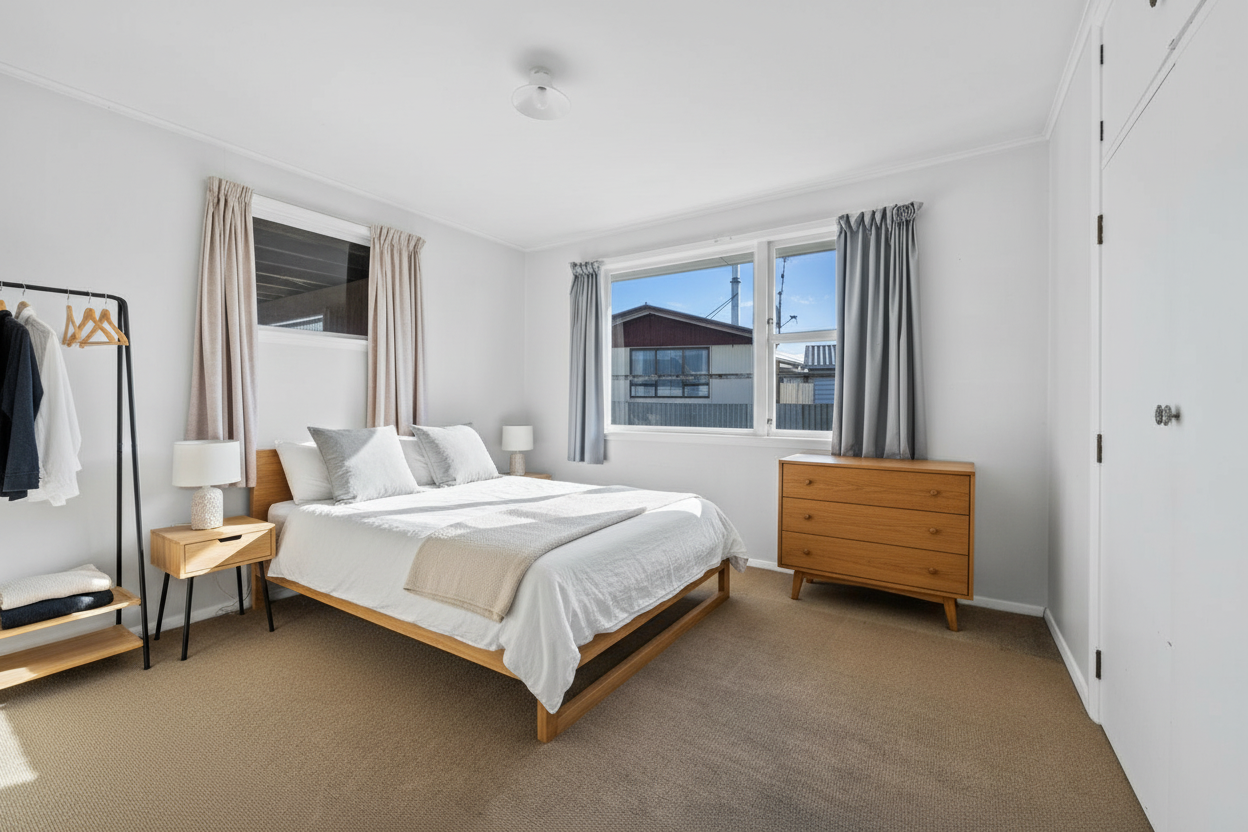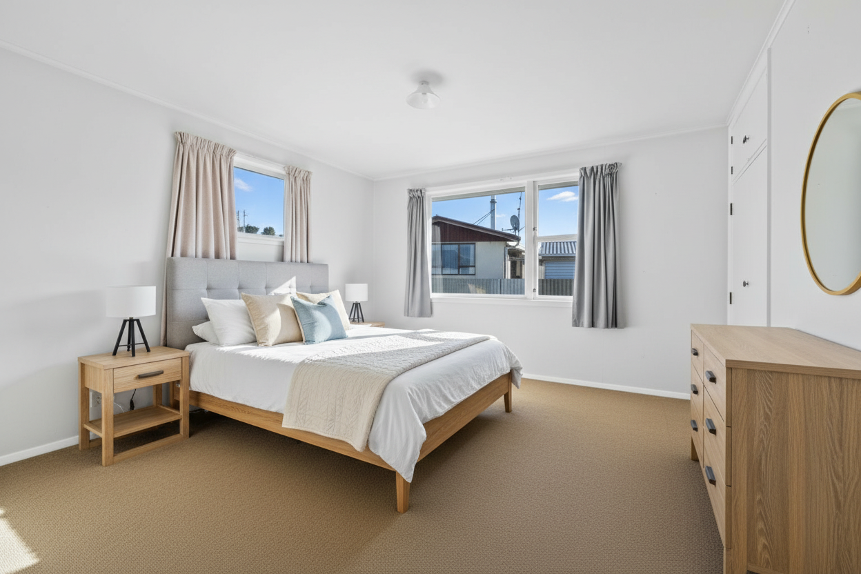 bed under smaller window do not change any features of the room do not remove or change windows or change view out do not change carpet do not change curtains keep room as it is just add furniture no headboard side tables plant in corner no drawers