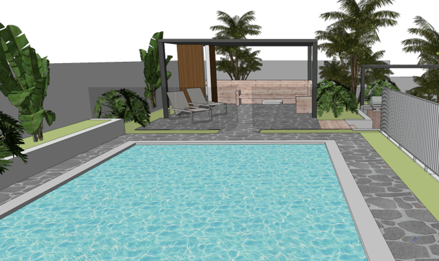 add planting swimmer in pool add cushions to timber seat