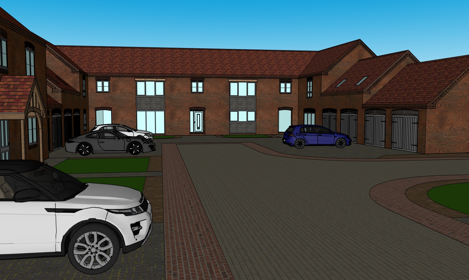 create an artist imperssion with planting to the outer edge of the grassed areas light grey windows and doors light rustic red roof pan tiles thin concrete pin edges to the road side set at same level because it shared surface light cloudy sky summer golden hour