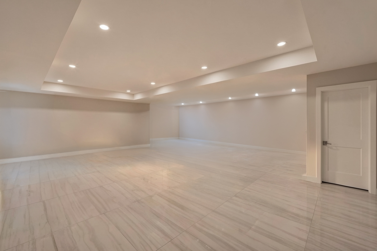 stage with some furniture and tv to the right wall and ping pong table minimalistic modern furniture