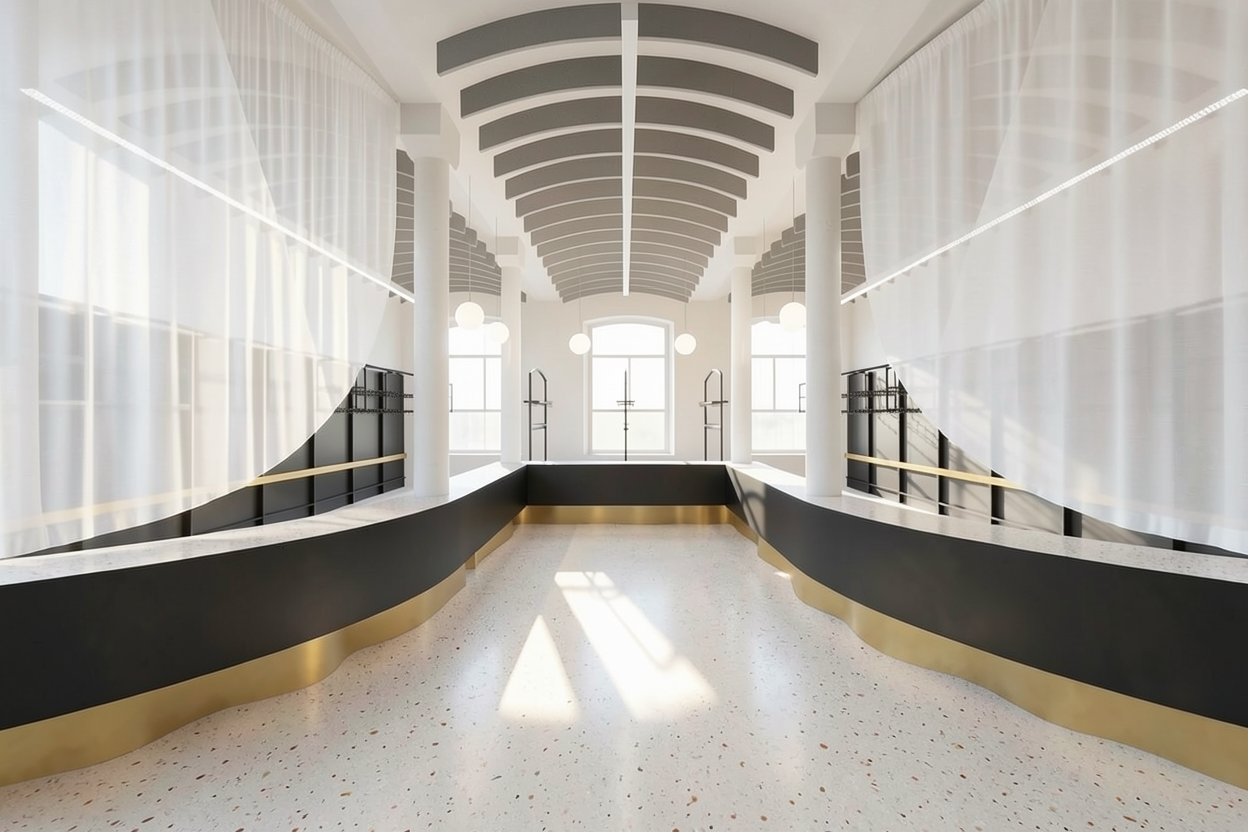 luxury transitional home office maintain the existing layout scale architectural details and camera perspective do not alter ceiling height window placement or overall room proportions design custom white oak millwork throughout the space with a warm natural finish all millwork hardware to be brass for a cohesive elevated look within the millwork panel interiors incorporate wallpaper insets using phillip jeffries 3576 all wound up in natural connection ensure the wallpaper is framed cleanly within the paneling and reads as a refined feature element on the wallpaper panel closest to camera install sconce urban electric esme sconce maintain proper scale and symmetry within the millwork layout trim above the millwork to be painted to match the ceiling color for a seamless transition and clean architectural line ceiling light fixture to be the urban electric chp chandelier do not alter placement or scale add soft natural sunlight entering from behind the camera casting light across the floor and extending toward the back of the room with realistic shadows and highlights create realistic highlights and shadows that enhance the texture of the wood millwork and wallpaper ensure the overall aesthetic feels high end and cohesive with a balanced contrast between warm white oak textured wallcovering and brass accents the space should feel tailored sophisticated and softly illuminated turn on all lighting