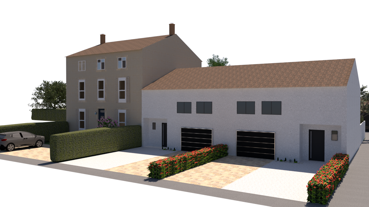 render a serene suburban street featuring a modern house the main building has light gray walls and dark gray windows with a warm terracotta roof adjacent lawns are lush with vibrant green hedges and trees add a neatly trimmed hedge with blooming pink flowers in front of one house render a sunny clear sky with soft ambient lighting to provide an inviting atmosphere the driveway is paved with light beige bricks and a sleek silver car is parked use a harmonious color palette to convey a peaceful welcoming suburban atmosphere