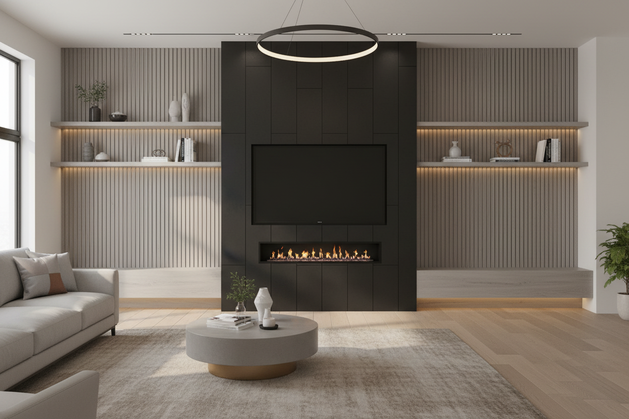 fireplace wall with flanking benches and shelves vertical wood slats behind the shelves wood is a blonde grey tone center section with fireplace and tv above is black large tiles ceiling is 10 tall give it a very contemporary look