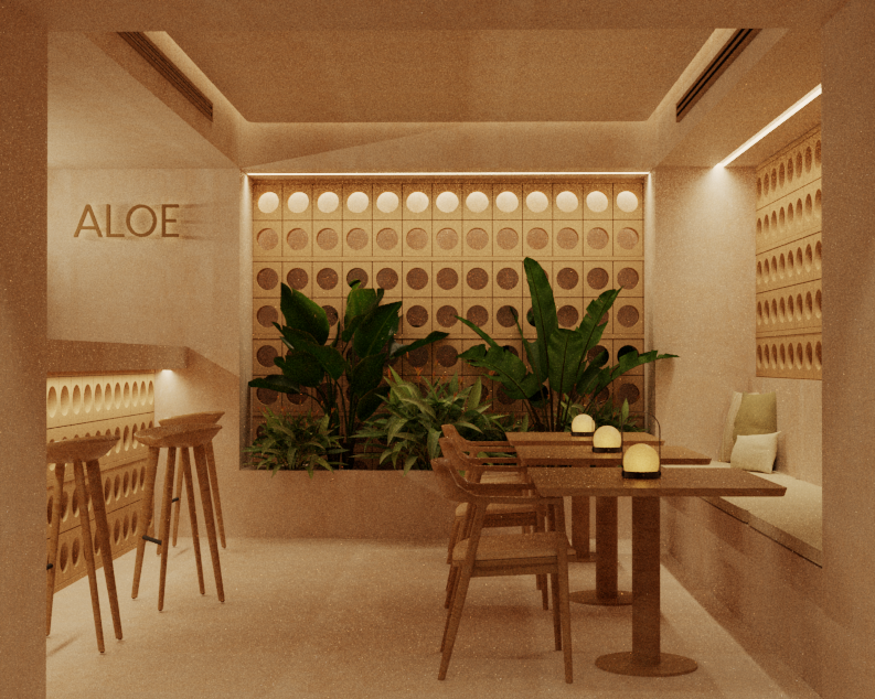 ultra realistic interior render preserve exact composition and camera all lighting must be artificial only warm and controlled no natural light influence lighting fully artificial lighting scene warm temperature 2700k 3000k balanced and soft indirect cove lighting in ceiling subtle glow not overexposed table lamps emit soft diffused light no burned highlights controlled reflections walls arcilla interior clay plaster finish smooth but with subtle handcrafted irregularity fine grain texture slightly matte with micro variation in tone soft transitions no harsh edges slight depth and shadowing in corners back wall barro celos a solid clay modules terracotta tone visible piece joints and despiece slightly irregular each module has real thickness and depth circular perforations must feel carved not graphic interior of holes darker with soft shadow gradient slight tonal variation between pieces wood furniture natural wood warm tone matte finish no gloss fine controlled grain not exaggerated subtle imperfections and variation realistic edge softening floor large format rectified porcelain sand beige tone very thin joints matte finish with slight texture variation clean but not perfectly uniform textiles seat cushions in natural linen fine weave visible matte slightly irregular tone soft slightly wrinkled realistic padding vegetation natural dense layered leaves with variation in tone and translucency correct interaction with artificial light no intersections with walls or geometry metal signage details aloe in brushed bronze soft reflections not mirror like subtle depth and relief ceiling clay plaster ceiling with recessed perimeter lighting smooth slightly imperfect surface no plastic appearance overall goal hyperrealism through material accuracy light control and subtle imperfections calm warm editorial atmosphere no flat surfaces no cgi plastic look