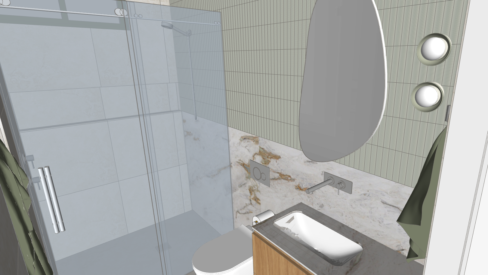 render this bathroom like the image on the floor and walls is a 600x1200mm creamy beige tile with subtle veining starting from the height of the bottom side of the niche along the right side wall is a sage green mosaic tile this tile goes to the ceiling the bottom half of this wall is palazzo dolomite https www cdkstone com au product palazzo stone slabs which continues to the benchtop of the vanity add warm light from the sconces green towels are hanging on the towel rails and the towel hook brushed nickel tapware