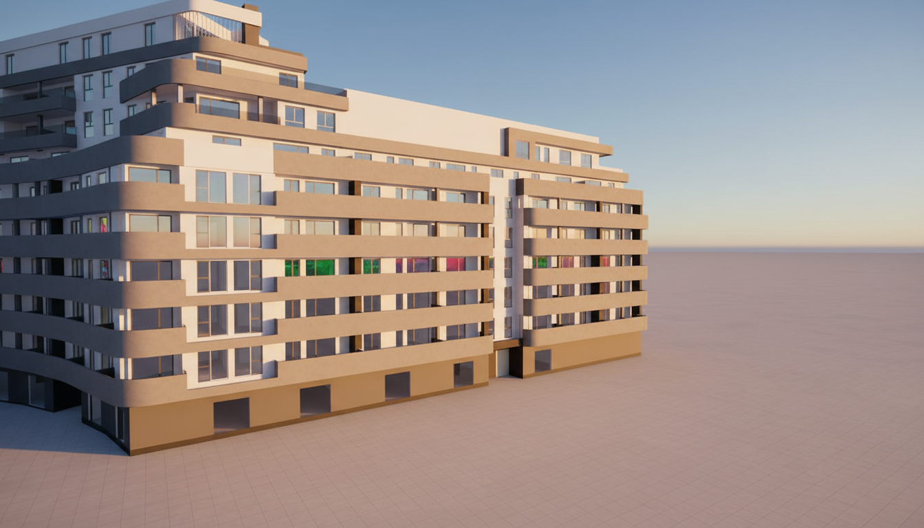 quiero que a traves de la ventana se vea un edificio de viviendas el edifio sea mas peque o y mas cercano