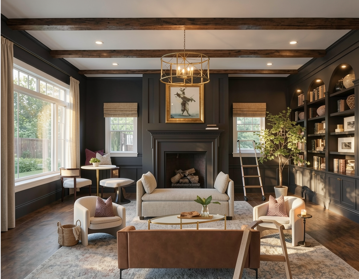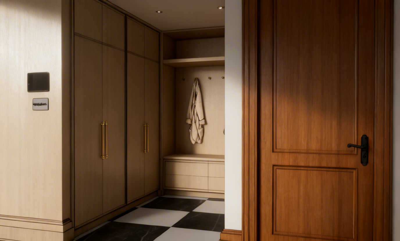 front view of a hotel room the same room like the reference images add curtains to the window table and wardrobe in the middle of the room is a door