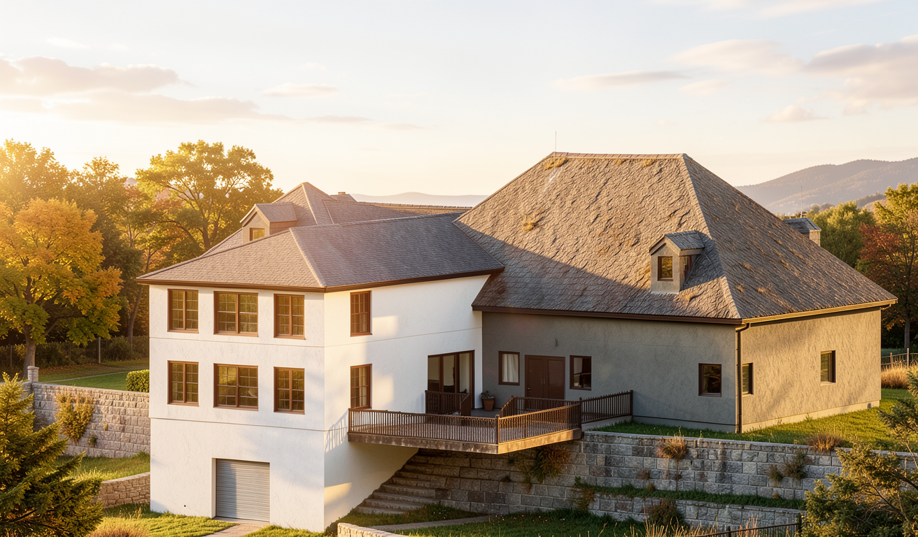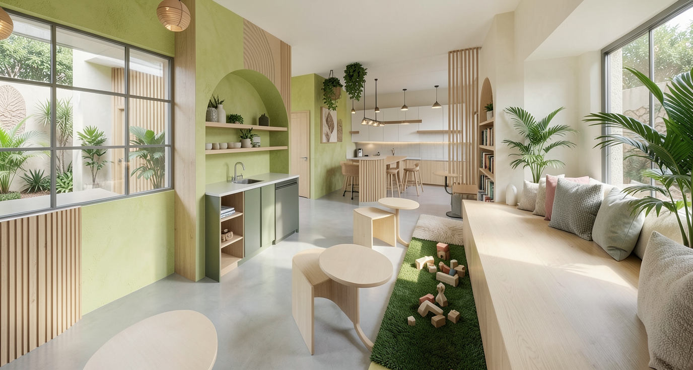 render the space in hyper realistic visualization quality at 8k resolution keep the shape of the vanity exactly as shown the cabinet should be a light colored concrete texture the floors walls and ceiling should all use the same continuous light limewash texture as in the reference image clearly showing a soft limewash painted finish rather than a flat color the mirror should have a gentle natural reflection so it reads clearly as a real mirror include three small recessed ceiling lights positioned above the vanity through the windows trees should be visible outside to create a natural exterior view the overall image should feel realistic calm and natural with accurate lighting and material texture