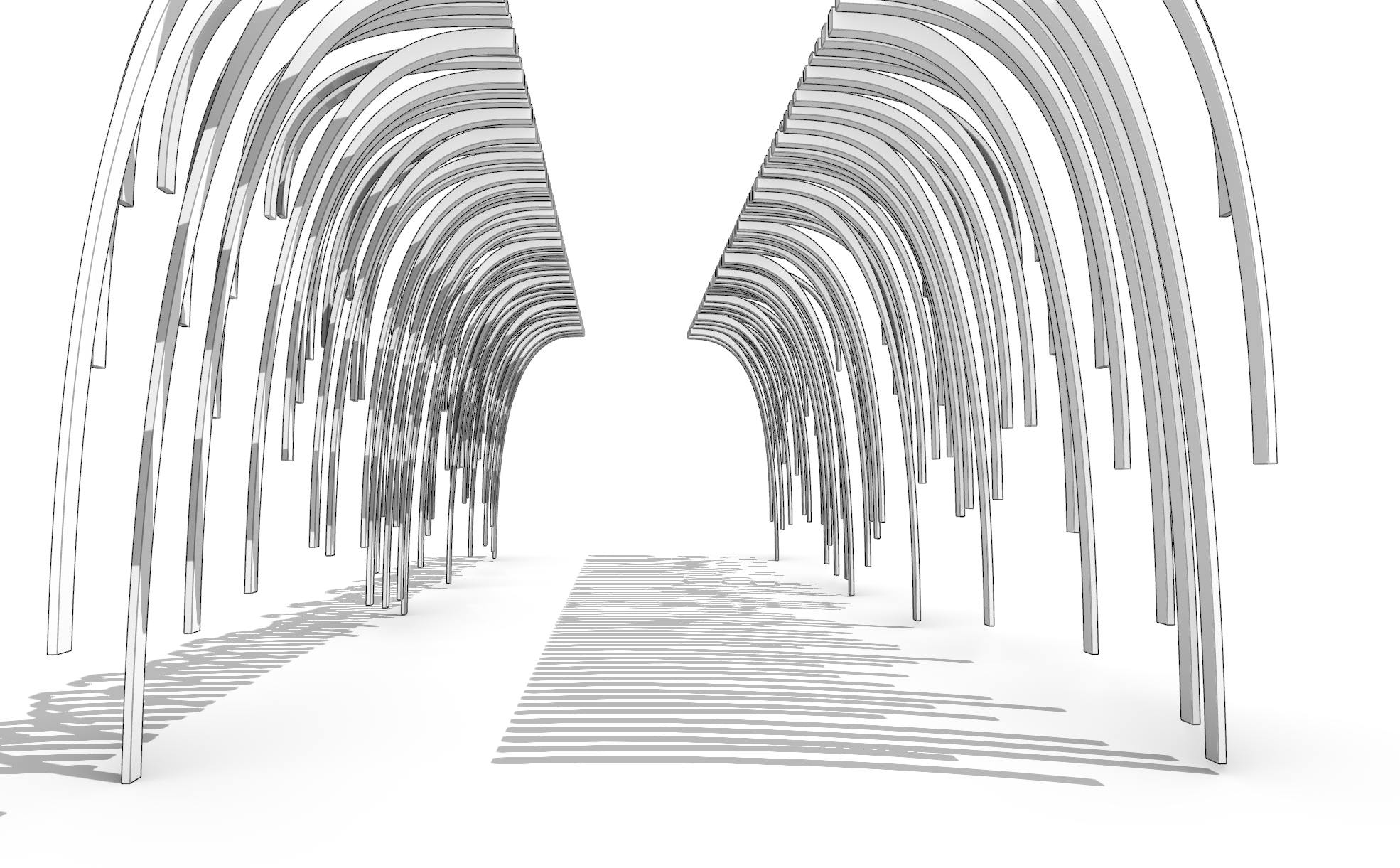 render it to be a threshold to a building but make sure the shadow stays the same make the building behind the threshold add people in it as well do not change the model keep the beams the same make sure its flat not going up understand that this is a perspective and it looks like it is going up but it is actually on the same level make the building behind it more of a glass wall building with greenery make it on a bridge