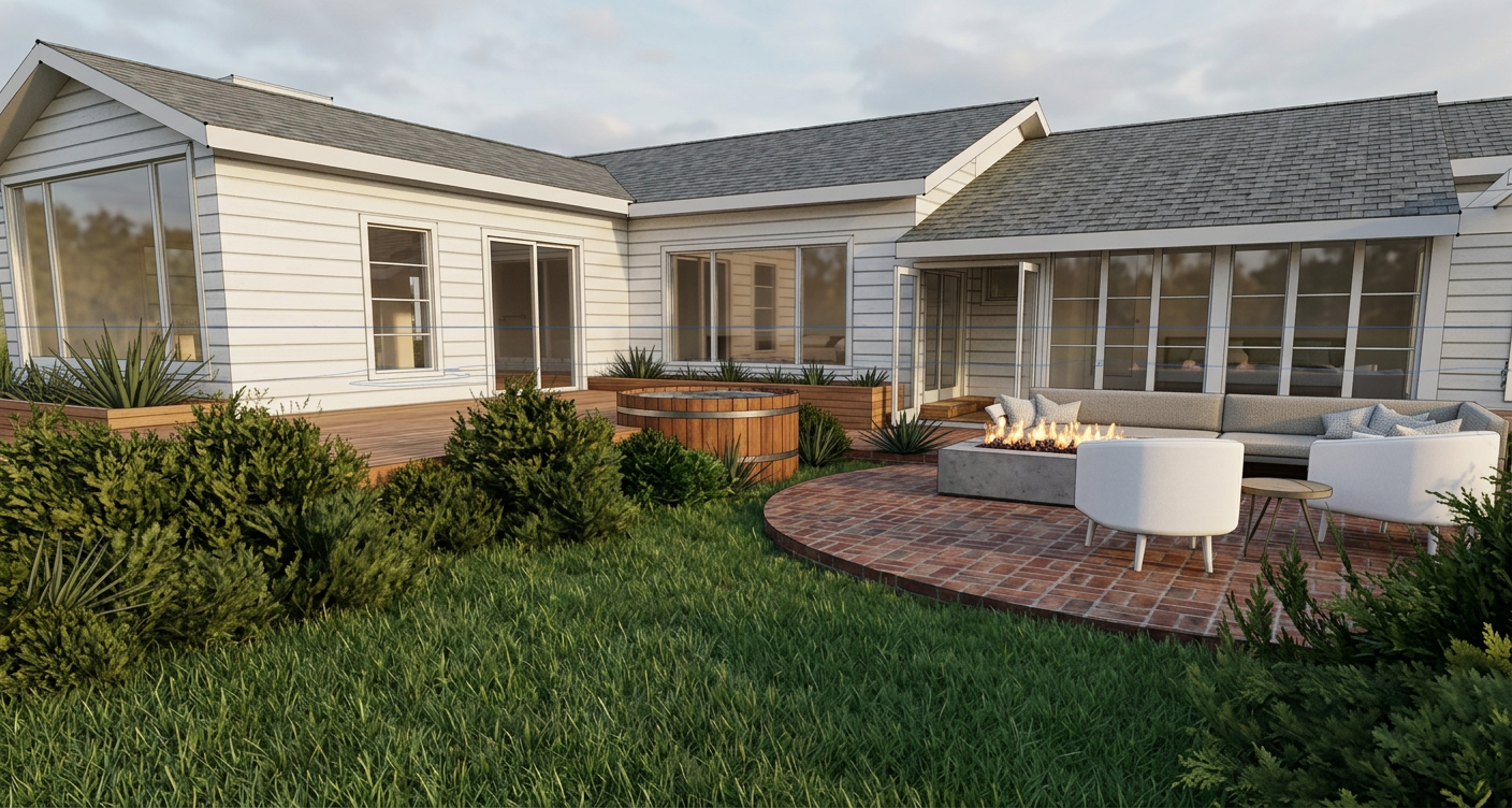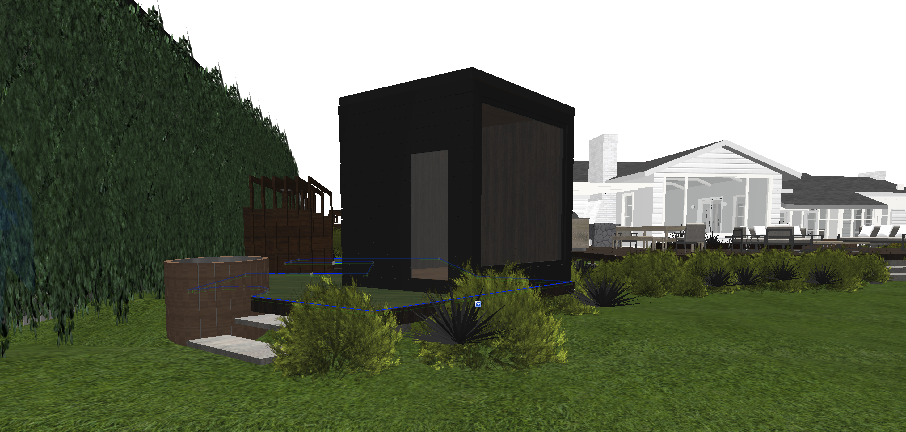 make this sauna and cold plunge and outdoor shower look as cozy as possible shroud everything with tea trees with small white flowers
