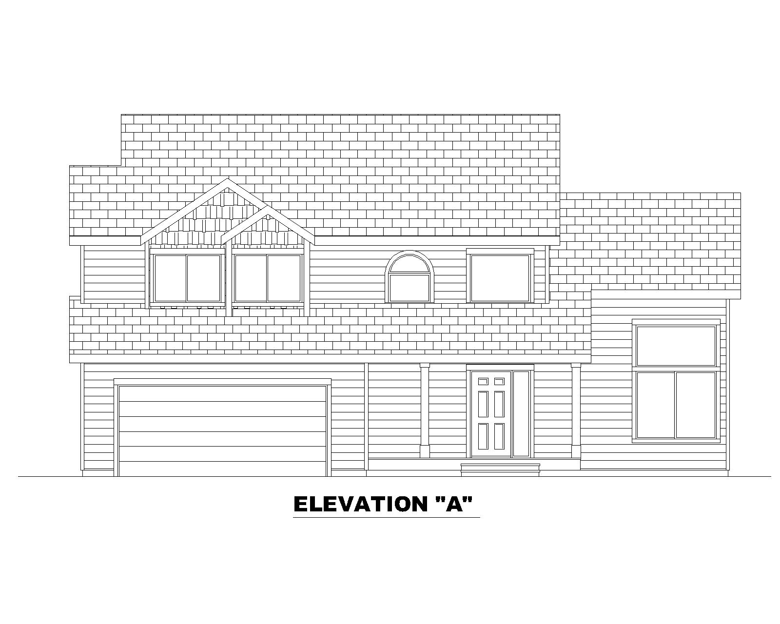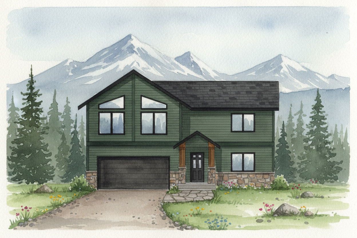 watercolor render of modern farmhouse home with white paint with black trim and wood accents include trees and an alaska like environment in the background simple driveway and walkways in front of the home