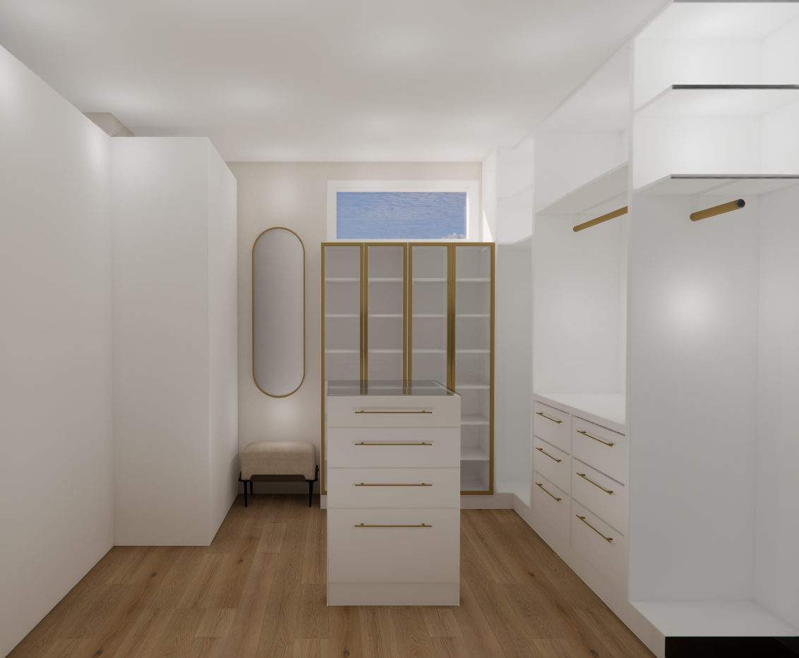make photo realistic add natural bright lighting add purses to the shelves in the cabinets with the gold doors add hanging clothes to the clothing rods