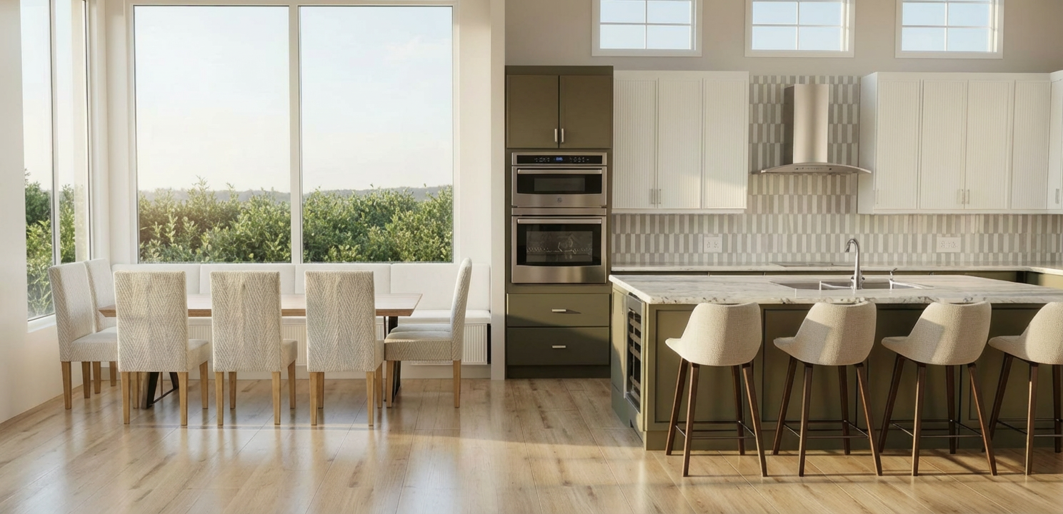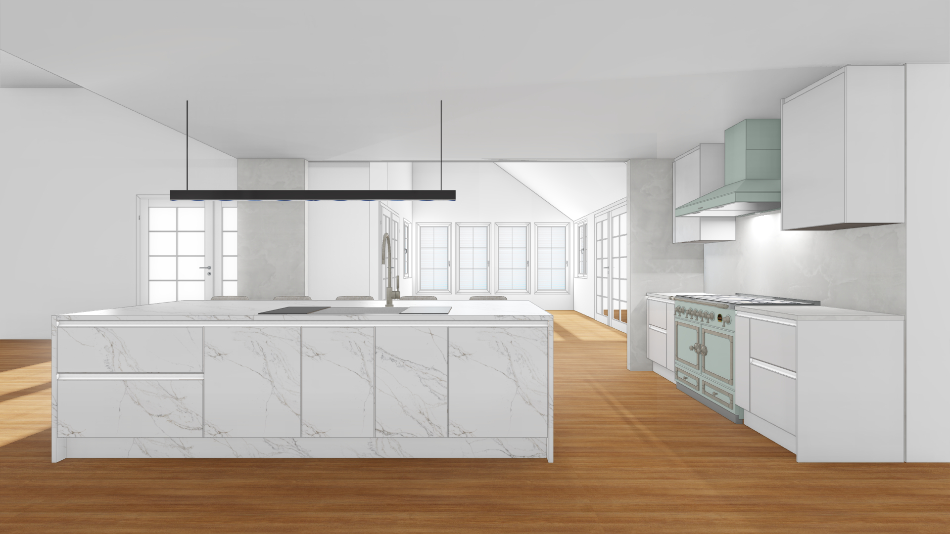 add white vase with cherry blossoms on the island moody light cabinets in white matte flat doors and natural oak do not change cabinets nor add open shelves don t add new cabinets don t add new windows add ceiling spot lights foggy and sunny weather