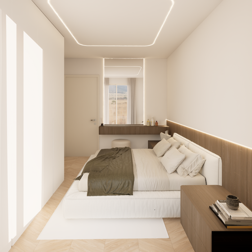 ultra high quality photorealistic render of this exact bedroom from this camera angle keep the same design same layout same bed position same wardrobe mass on the left same floating vanity same mirror placement same bedside table same headboard wall same ceiling led detail same door position same curtain placement and same floor pattern do not change the design or move anything make the scene look like a real premium interior photograph with warm minimal luxury styling and believable material depth material direction wardrobe on the left should remain warm off white ivory matte seamless and clean walls should stay soft warm ivory wood cladding behind the bed bedside table and vanity should be warm natural oak veneer with fine grain seamless texture mapping and a premium matte satin finish floor should remain light oak herringbone parquet with subtle variation realistic scale and soft reflection bed upholstery should stay soft ivory beige fabric pillows and bedsheets should look more natural layered and realistic with refined folds and premium textile texture dark throw blanket should remain but look richer with believable woven texture and elegant drape mirror should keep the same position and shape but have more realistic reflection depth curtain fabric should remain light and sheer with natural translucency and soft folds lighting preserve the existing indirect ceiling led preserve the warm linear led behind the wood headboard panel keep the vertical light framing around the mirror vanity area use soft natural daylight from the window create realistic bounce light soft contact shadows and balanced contrast no harsh glare no flat cg lighting no blown highlights rendering quality ultra realistic materials seamless oak veneer texture realistic fabric folds and textile depth crisp joinery and clean panel lines subtle believable reflections only where needed high end residential interior photography mood calm elegant minimal luxury atmosphere important do not change the furniture design do not move the bed do not change wardrobe shape do not change vanity or mirror design do not change the headboard wall composition do not add extra decor or furniture only improve realism materials and lighting quality negative prompt do not change design do not change layout do not move furniture no redesign no extra furniture no extra decor no glossy wardrobe no plastic looking fabric no fake reflections no harsh shadows no overexposed highlights no clutter no low realism