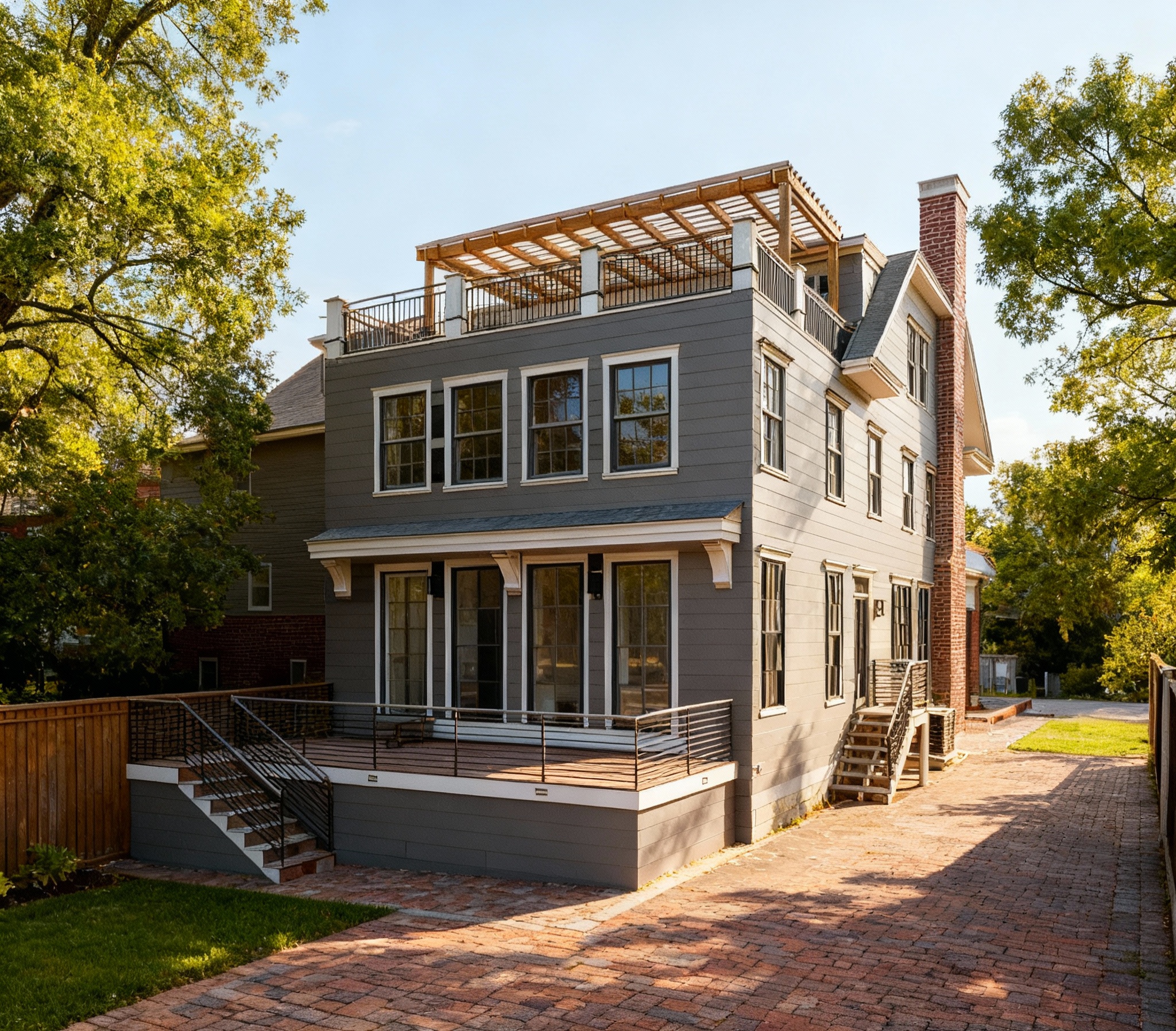 make trellis on upper floor white make chimney white brick no tree on the left replace driveway pavers with concrete