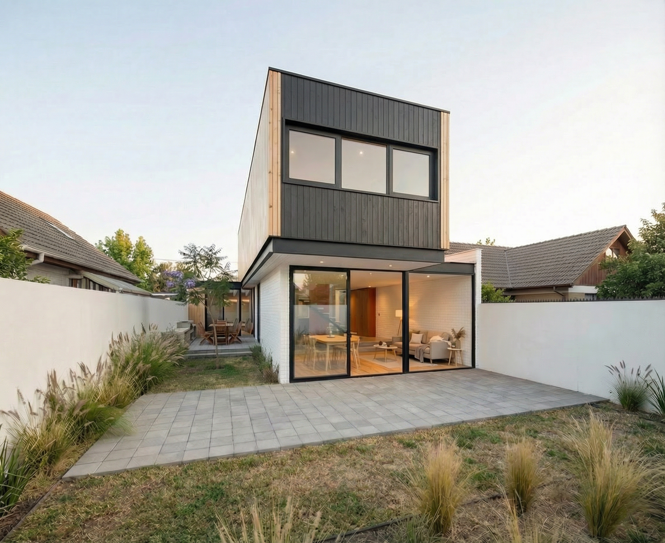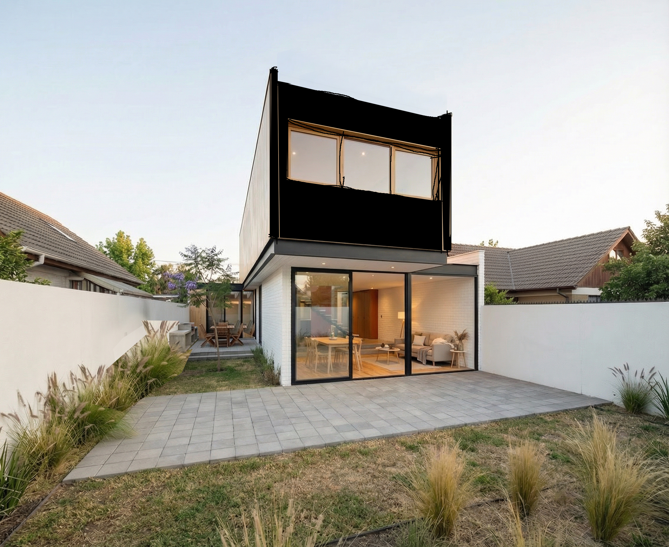 exterior image render instructions it is very important that the base geometry is not modified under any circumstances i made several corrections using pencil marks and cut and paste adjustments on the reference image these corrections must be accurately interpreted and merged into a single cohesive design resulting in one unified and consistent 3d model the final image must be a highly realistic render where all corrections appear fully integrated not added afterward the overall style must follow a scandinavian architectural language clean lines simple volumes natural tones and a calm warm atmosphere second floor the lateral fa ades must be finished in light colored wood the front fa ade including the profiles and window frames must be in a dark tone the front fa ade material must be smooth and non wood painted or similar with a clean uniform finish respect the existing geometry the front fa ade is set back in relation to the lateral fa ades and must not be moved or realigned