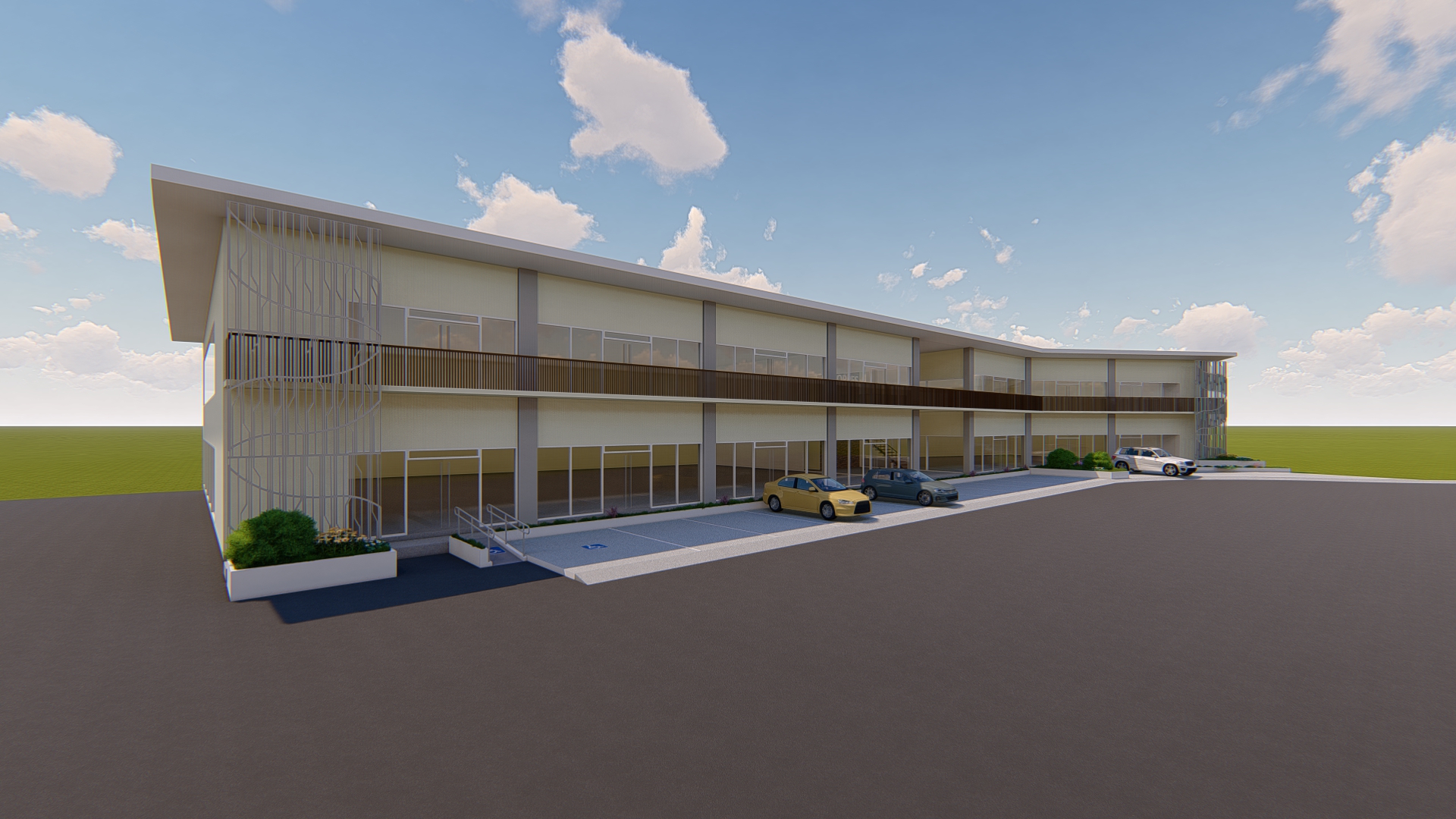 make this in realistic architecturally rendered add entourage to make it alive make the trees in sunset color do not change anything on the building just enhance the render add small plants on the green parts add elements inside the building like appliances staging display while the top most floor is an office area