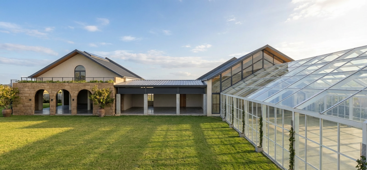 change the stone cladding at the left building with rectangular machine cut adobe stones