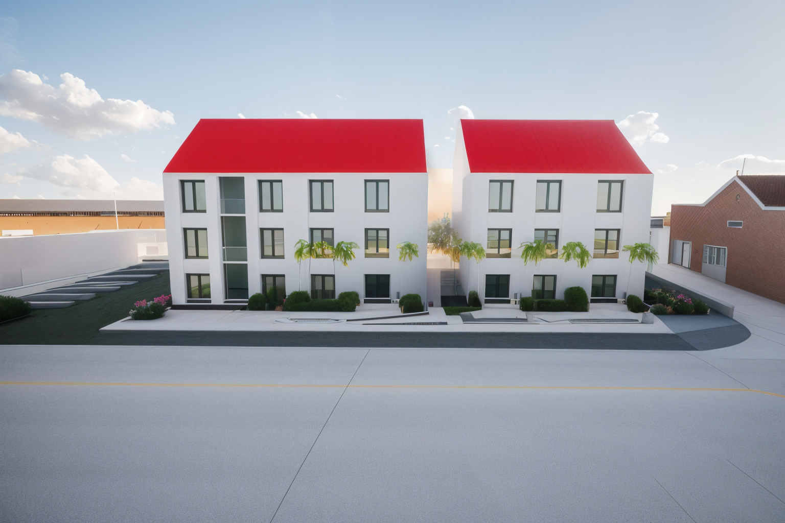 modern exterior shot a modern three story residential building with a sleek minimalist design the building has a cream exterior with wooden accents around the windows and balconies use light beige for the walls and warm oak brown for the wooden elements the atmosphere is peaceful and sunny with a clear blue sky in the background the windows should reflect soft sunlight creating a warm and inviting ambiance architecture
