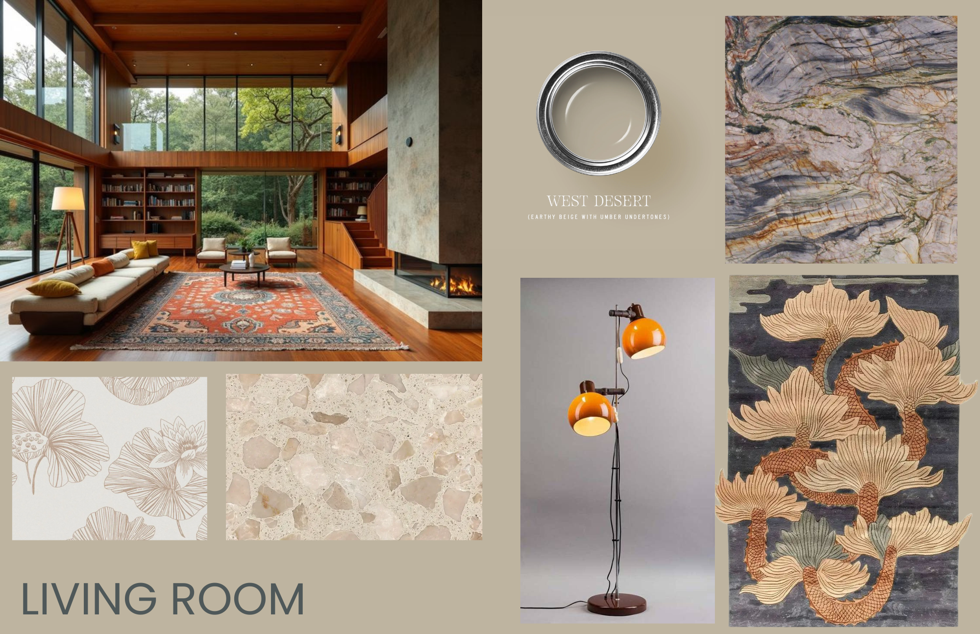 render a high end designer 70s modern living room from the moodboard featuring a slab of michelangelo quartzite as the fireplace show any light fixtures as illuminated and add warm sunlight from nearby windows ensure there are several plants around the space and staged with luxury decor include wallpaper in the architectural elements