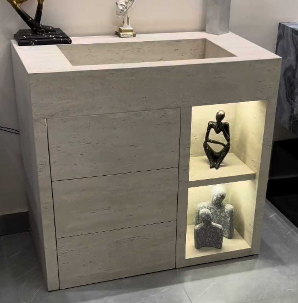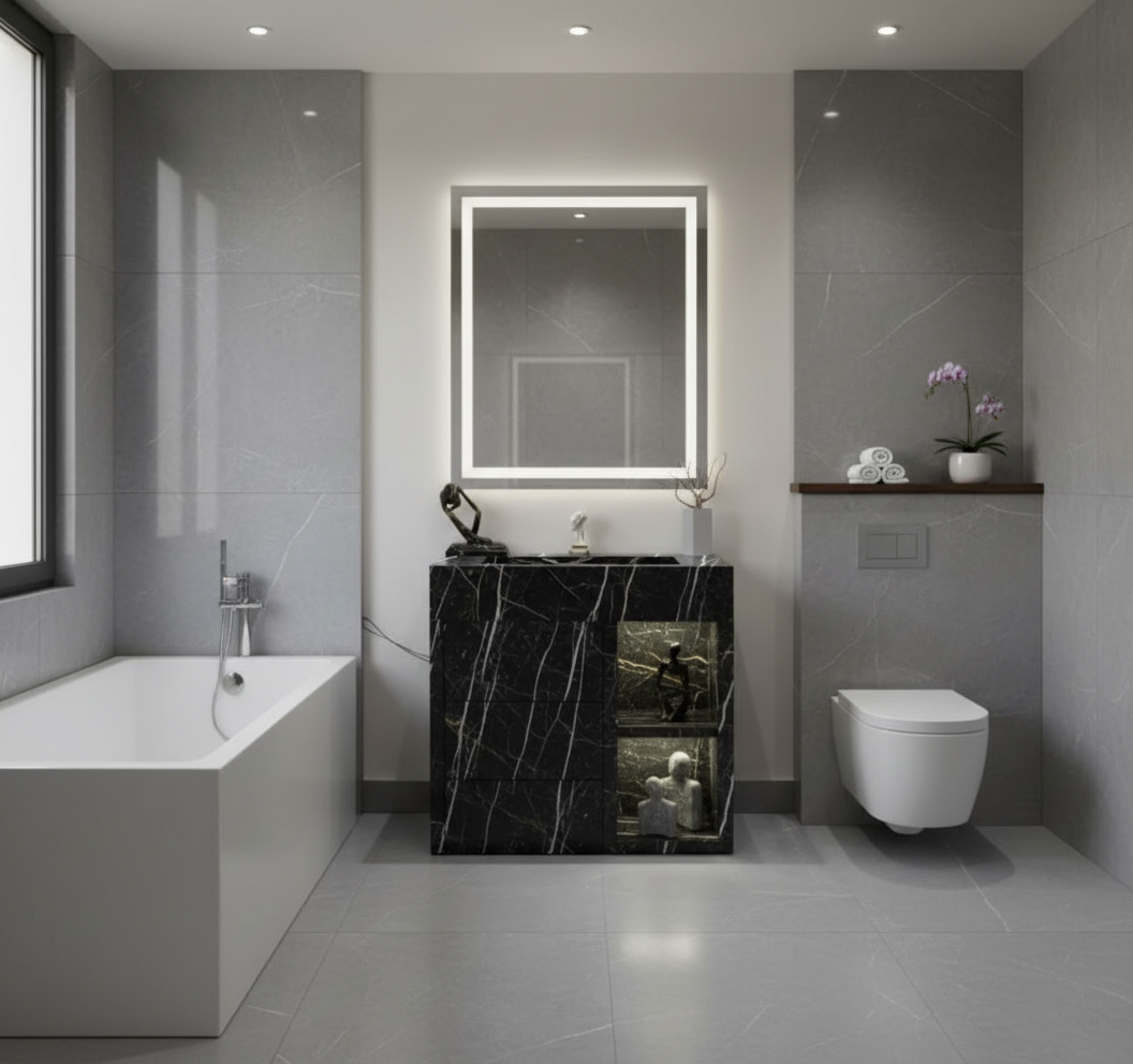 perspective shot white calacatta gold stone bathroom vanity in an elegant bathroom