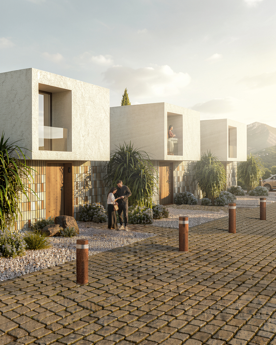 task add subtle human activity to make the scene feel alive and natural instructions add two children playing with a ball on the cobblestone street position them in the mid ground not too close to the camera show a simple natural interaction passing or kicking the ball ensure realistic scale and proportions add a single ball on the pavement clearly visible ensure correct shadow and contact with ground integration match lighting color and shadows with the scene ensure children blend naturally no cut out effect maintain perspective consistency with pavement style calm everyday residential life natural not staged subtle and believable constraints do not modify architecture do not change camera do not overcrowd the scene keep composition clean reinforcement scene should feel lived in but still calm and minimal focus on realism and integration avoid exaggerated motion or unnatural poses