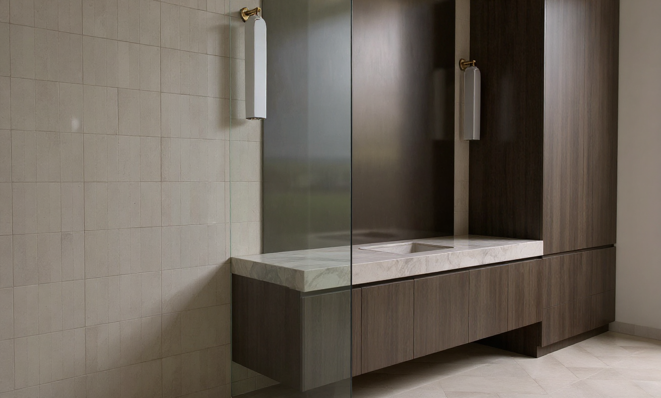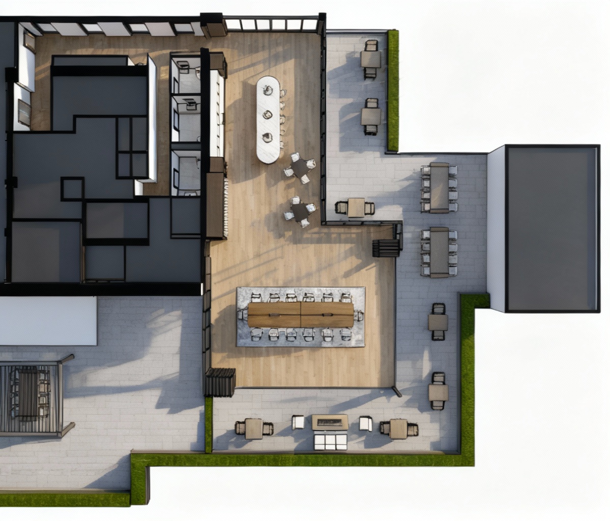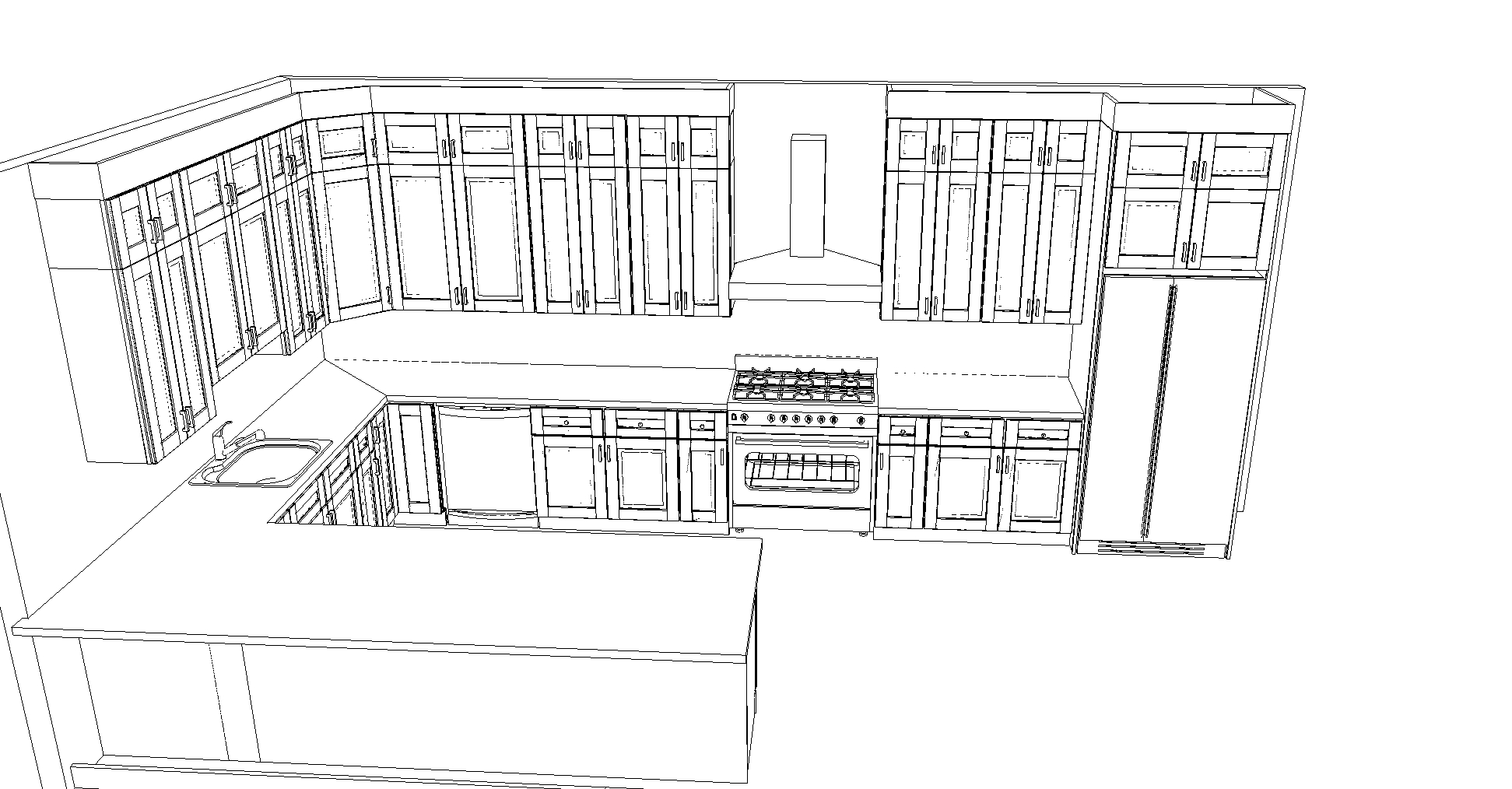 apply the following finishes to the kitchen shown in the line drawing main cabinetry in e2 charcoal deep charcoal gray matte finish island cabinetry in b8 butterscotch warm honey toned woodgrain with a subtle satin sheen countertops in white marble with light grey veining for both perimeter and island brushed nickel hardware light natural hardwood flooring with visible grain stainless steel appliances and white walls keep details and geometry identical