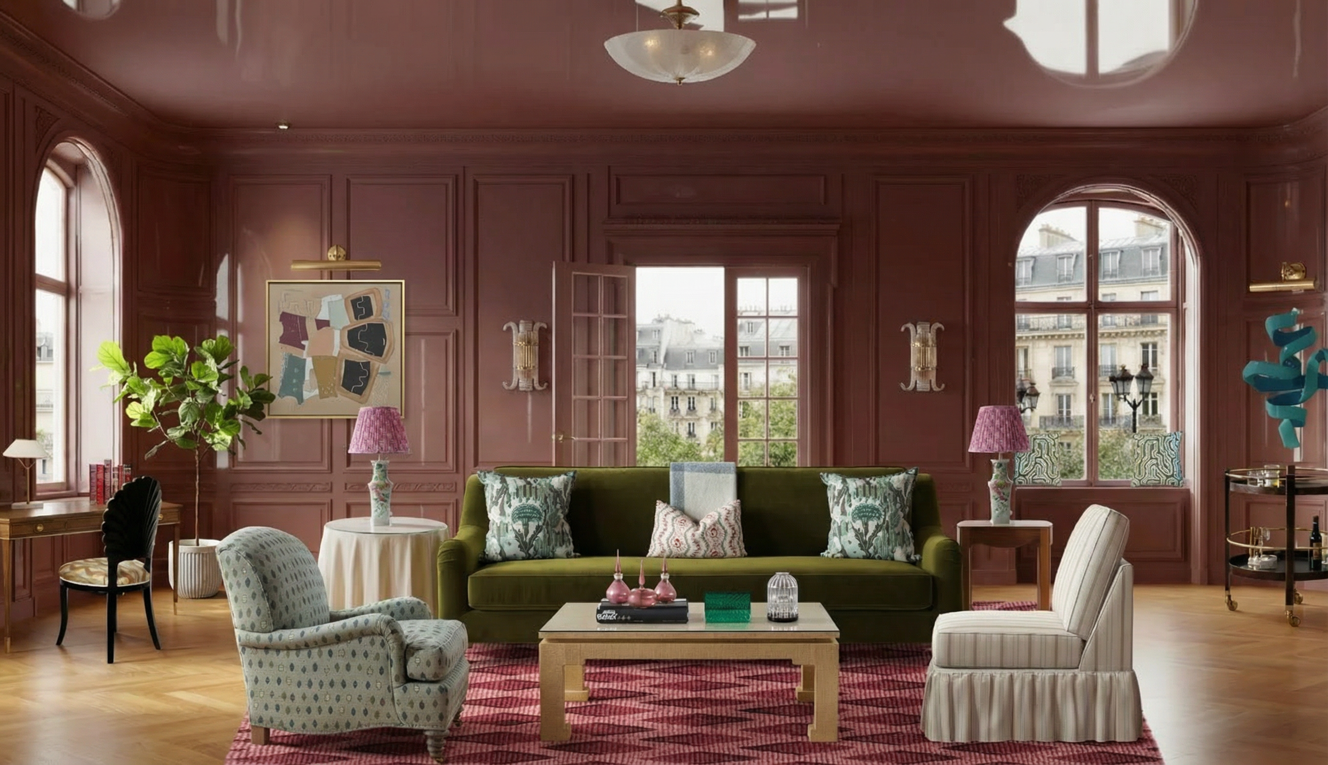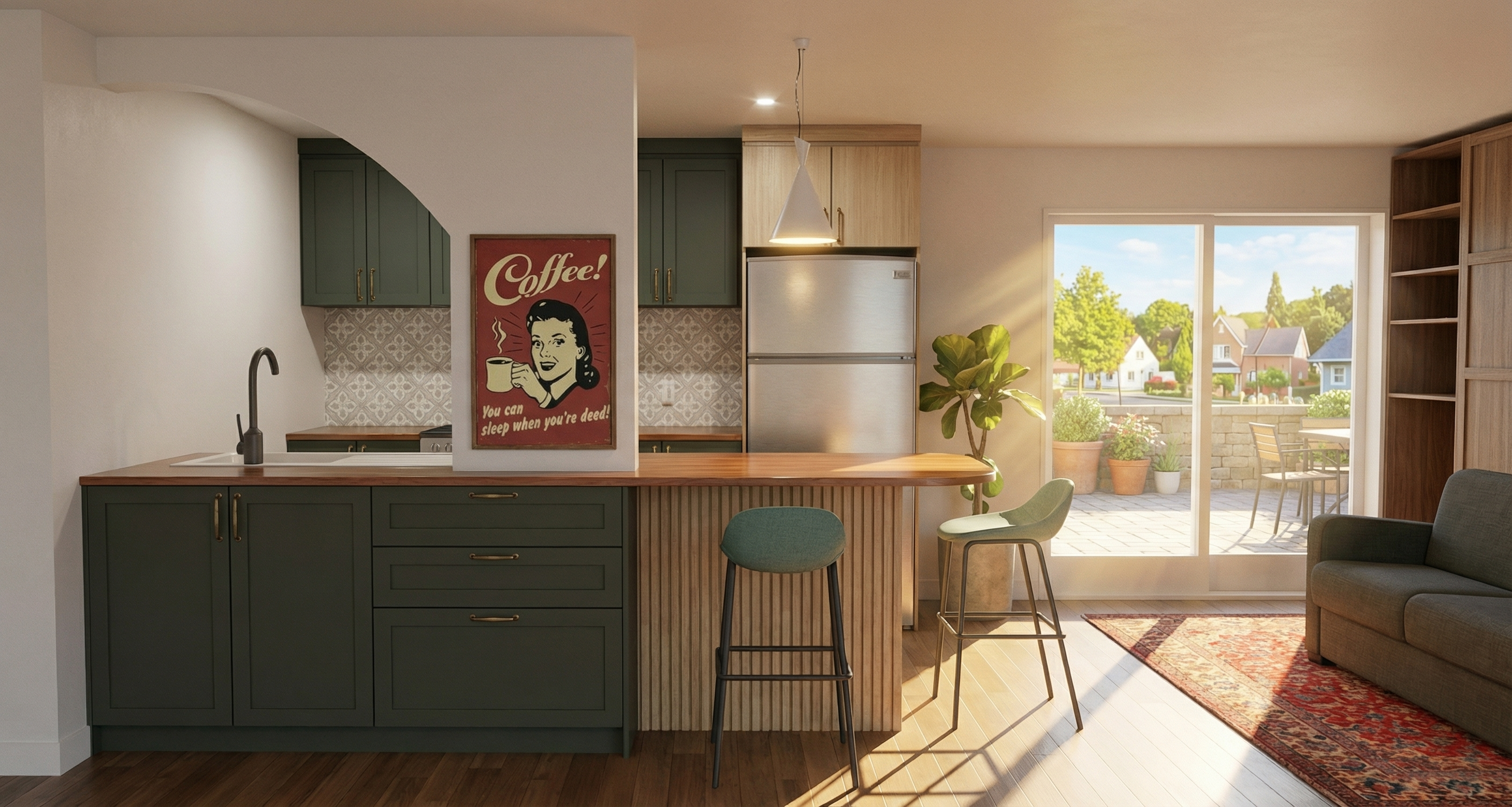 render this building metal window framing cream brick color at front add some green between buildings change horizontal floor mullion black metal