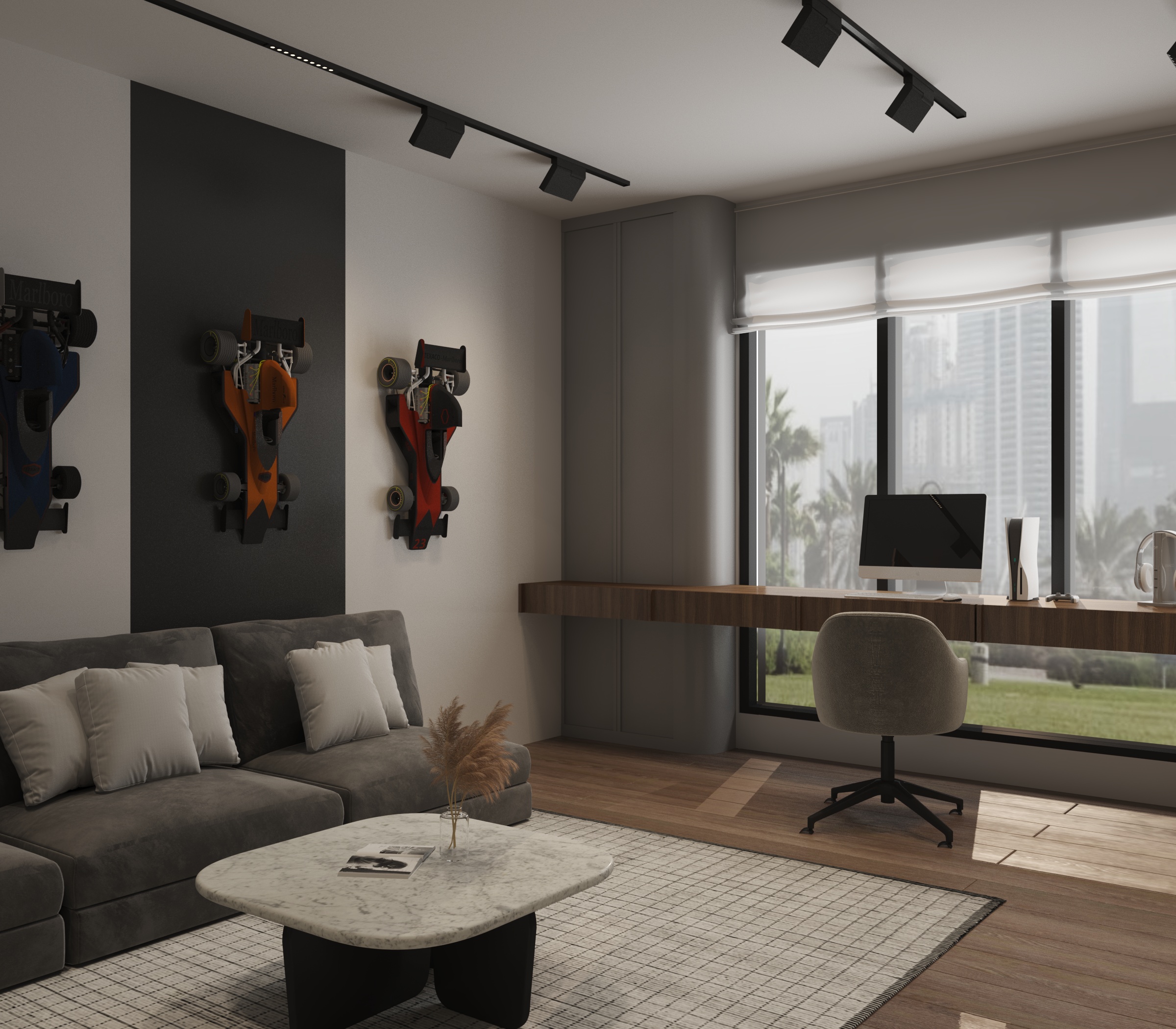 can you make the outdoor through the window more realistic the outdoor is in dubai with a mix of greenery and in the bakcground building