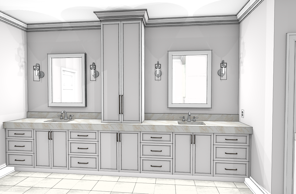 show a warm toned white bathroom add daylighting and ambient lighting from toe kick mirrors and sconces