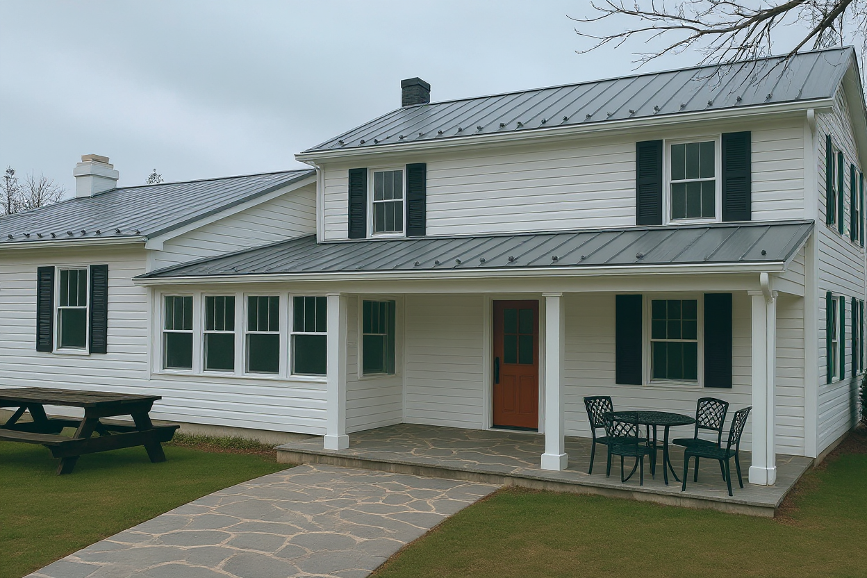 please extend the flagstone out to the left more to meet the 1st window of four on the left of the small addition these 4 side by side windows should extend to the base about 12 inches to make them taller also extend flagstone out 4 more feet into the foreground for more ample space to gather please omit the picnic table on the grass and the table and chairs on the porch patio please eliminate the width of the space to the left of the entry door by 18 inches and shift door proportionately closer to the left corner of that wall all other windows on the 2nd floor stay the same and all colors stay the same including the shutter color stays black
