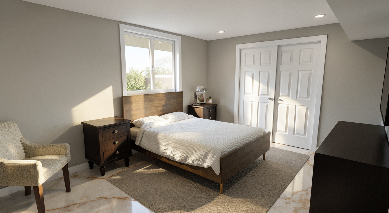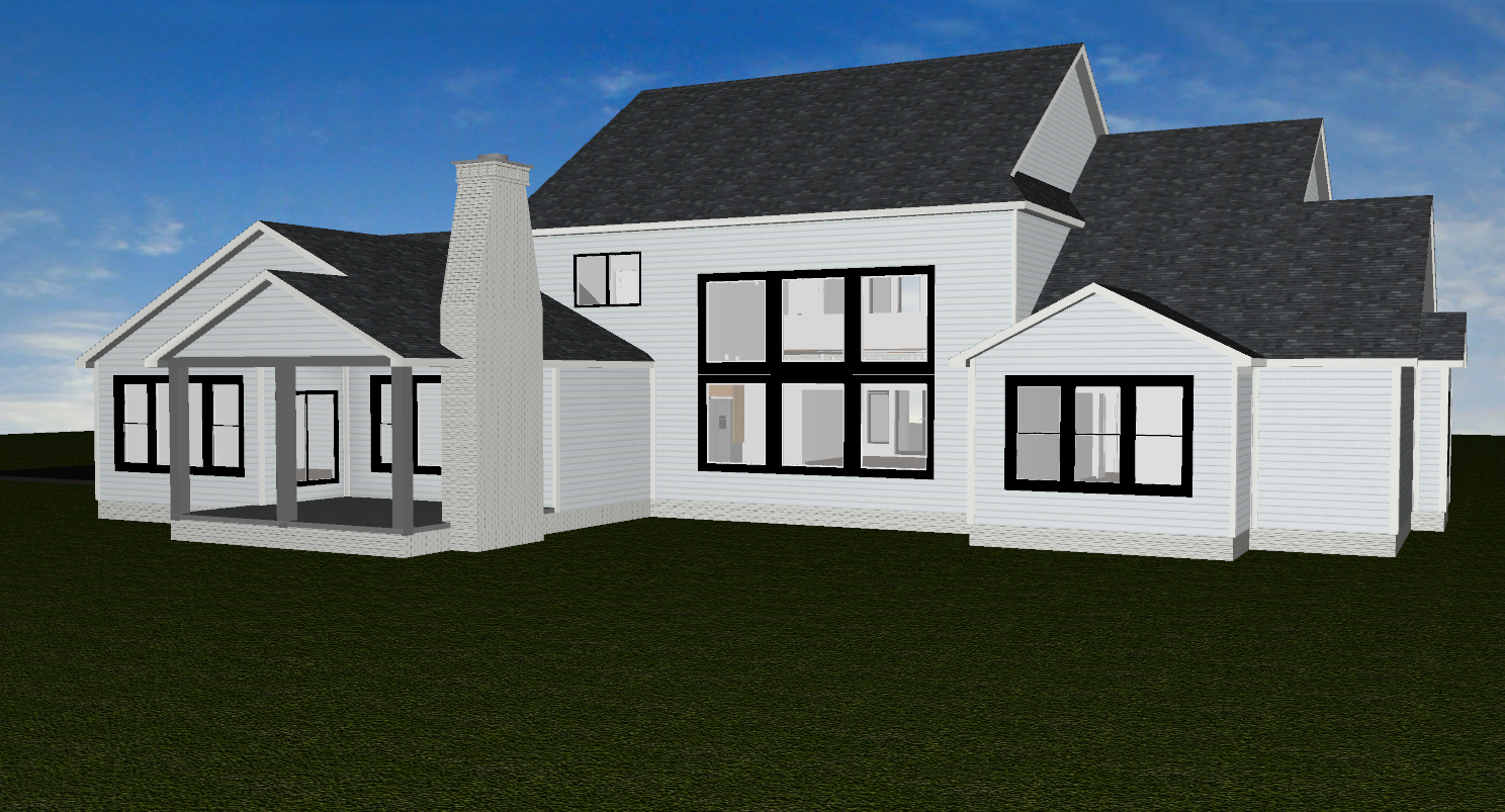 make as photorealistic as possible while keeping textures the same as selection professional landscaping in a lightly wooded scene with good lighting match materials to plan and remove any text white siding black trim black windows black porch post