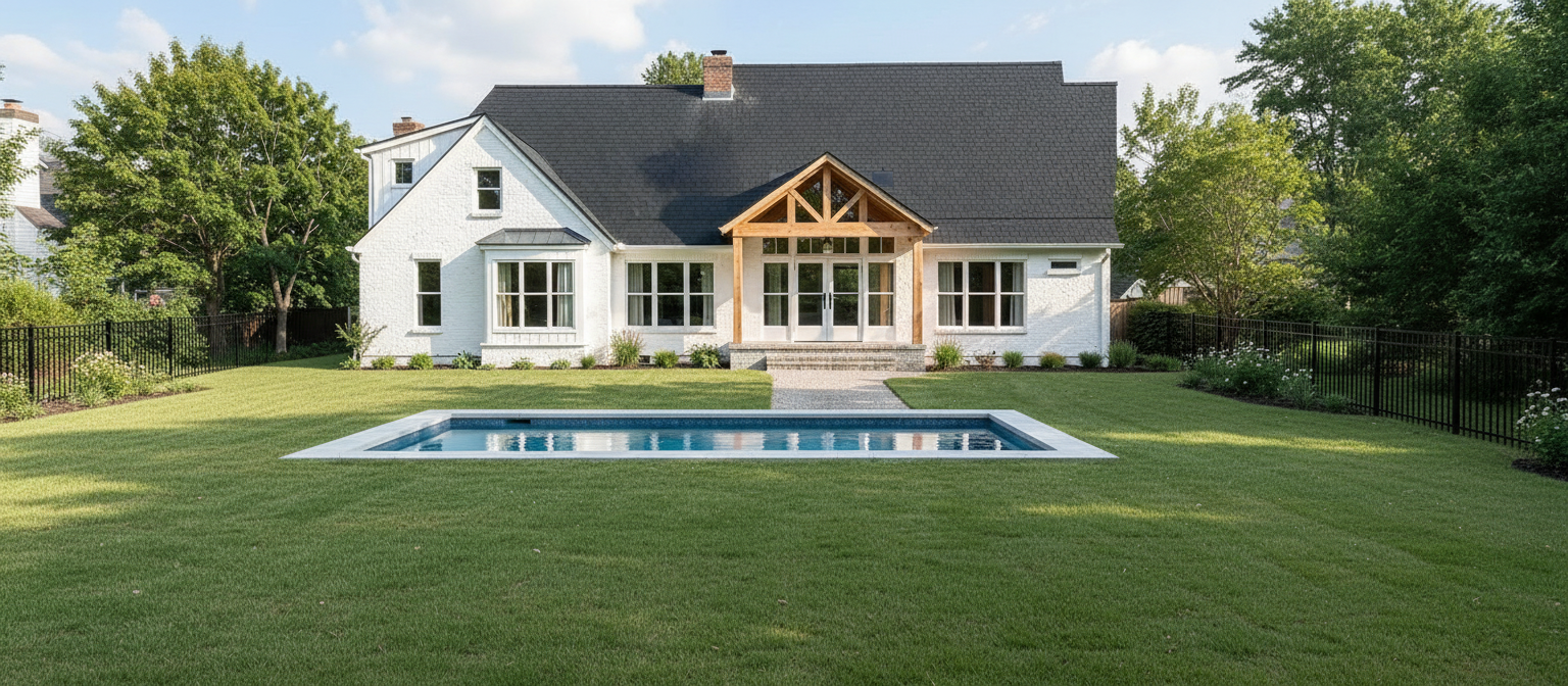 white birck siding black shingle roof extend the left side of the house towards the viewing angle 20 feet make the back porch floor washed red brick paint the back porch wood walnut color make windows grey screen in the porch